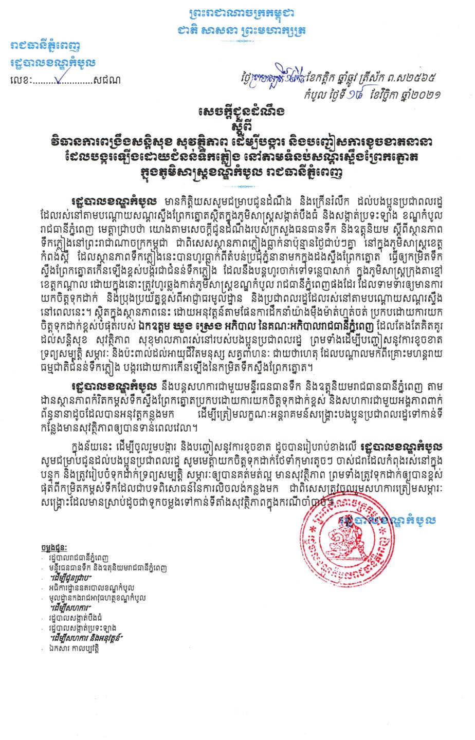 រដ្ឋបាលខណ្ឌកំបូល ជូនដំណឹងបងប្អូនប្រជាពលរដ្ឋនៅតាមទំនប់សណ្ដរស្ទឹងព្រែកត្នោត ត្រៀមបង្ការ និងបញ្ជៀសការខូចខាតនានា ដែលបង្កឡើងដោយជំនន់ទឹកភ្លៀង