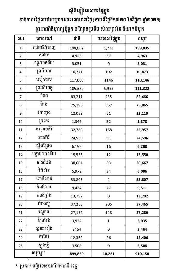(ភ្នំពេញ)៖ បើតាមឯកឧត្ដម ថោង ខុន រដ្ឋមន្ត្រីក្រសួងទេសចរណ៍ បានមានប្រសាសន៍ថា៖ នាឱកាសថ្ងៃឈប់រយៈពល៣ថ្ងៃ នៃព្រះរាជពិធីបុណ្យអុំទូក បណ្តែតប្រទីប និងសំពះព្រះខែ អកអំបុក ត្រូវនឹងថ្ងៃទី១៨-២០ ខែវិច្ឆិកា ឆ្នាំ២០២១ ភ្ញៀវទេសចរដែលចេញដើរកម្សាន្តនៅទូទាំងប្រទេសមានចំនួនសរុប៩១០,១៥០នាក់ ក្នុងនោះភ្ញៀវជាតិមានចំនួន៨៩៩,៨៦៩នាក់ និងភ្ញៀវបរទេសផ្ទៃក្នុង១០,២៨១នាក់។