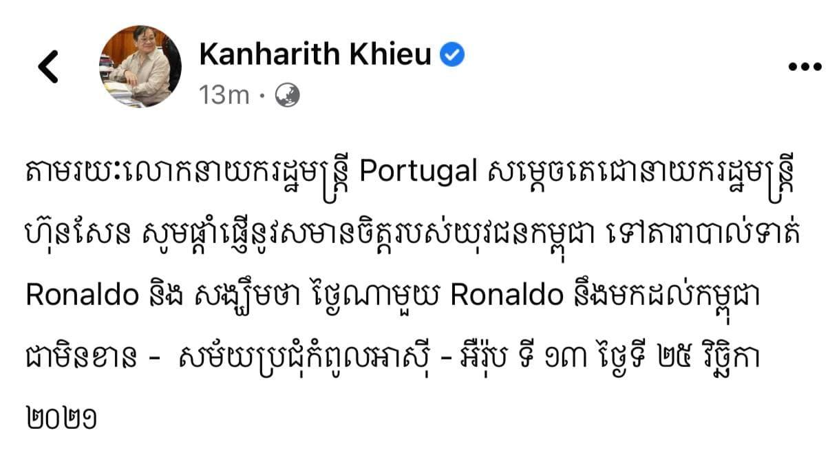 ឯកឧត្តម ខៀវ កាញារីទ្ធ បានបញ្ជាក់នៅលើ Facebook យ៉ាងដូច្នេះថា៖ «តាមរយៈលោកនាយករដ្ឋមន្ត្រី Portugal សម្តេចតេជោនាយករដ្ឋមន្ត្រី ហ៊ុន សែន សូមផ្តាំផ្ញើនូវសមានចិត្តរបស់យុវជនកម្ពុជា ទៅតារាបាល់ទាត់ Ronaldo និង សង្ឃឹមថា ថ្ងៃណាមួយ Ronaldo នឹងមកដល់កម្ពុជា ជាមិនខាន»។