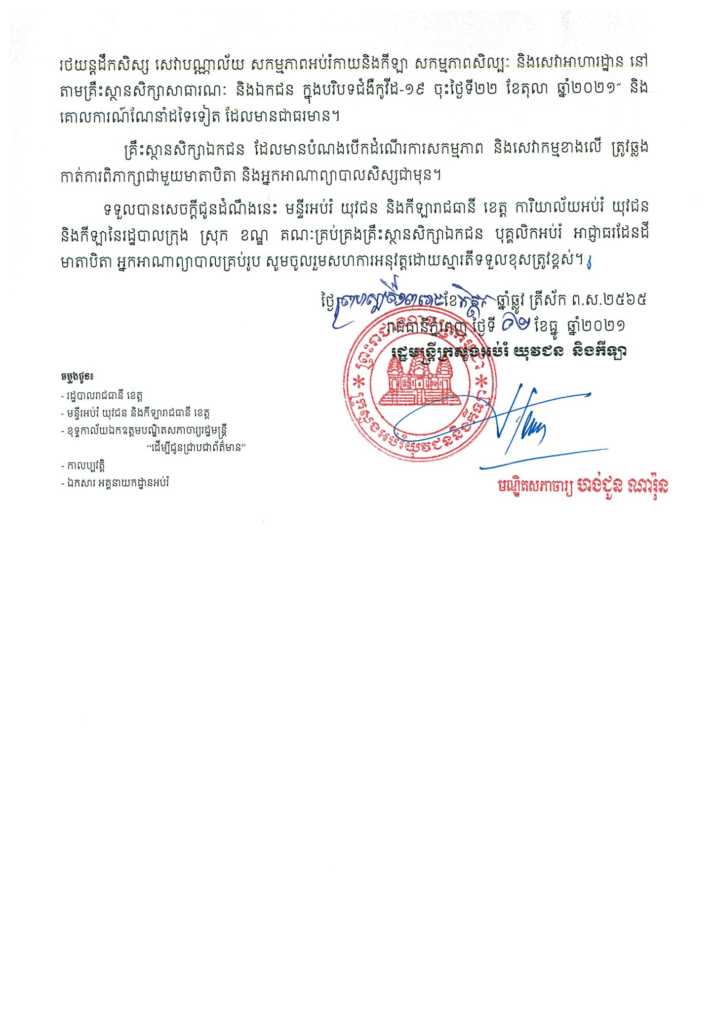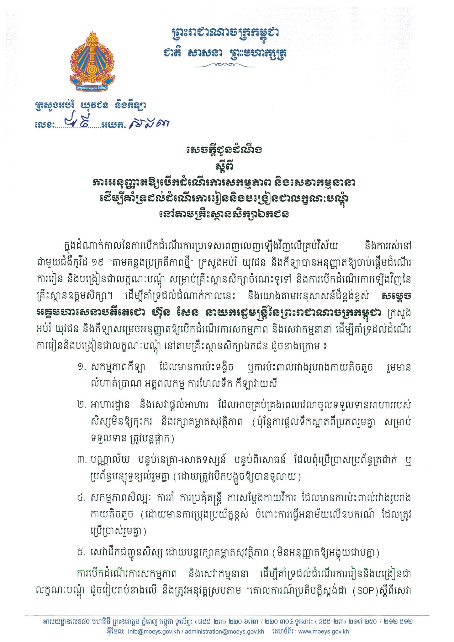 ក្នុងដំណាក់កាលនៃការបើកដំណើរការប្រទេសពេញលេញឡើងវិញគ្រប់វិស័យ និងការរស់នៅជាមួយជំងឺកូវីដ-១៩ តាមគន្លងប្រក្រតីភាពថ្មី ក្រសួងអប់រំ យុវជន និងកីឡា បានអនុញ្ញាតឲ្យចាប់ផ្ដើមដំណើរការរៀន និងបង្រៀនជាលក្ខណៈបណ្ដុំ សម្រាប់គ្រឹះស្ថានសិក្សាចំណេះទូទៅ និងការបើកដំណើរការឡើងវិញនៃគ្រឹះស្ថានឧត្តមសិក្សា។ ដើម្បីគាំទ្រដំណាក់កាលនេះ និងយោងតាមអនុសាសន៍ដ៏ខ្ពង់ខ្ពស់ សម្តេចអគ្គមហាសេនាបតីតេជោ ហ៊ុន សែន នាយករដ្ឋមន្ត្រីនៃព្រះរាជាណាចក្រកម្ពុជា ក្រសួងអប់រំ យុវជន និងកីឡាសម្រេចអនុញ្ញាតឲ្យបើកដំណើរការសកម្មភាព និងសេវាកម្មនានា ដើម្បីគាំទ្រដល់ដំណើរការរៀននិងបង្រៀនជាលក្ខណៈបណ្ដុំ នៅតាមគ្រឹះស្ថានសិក្សាឯកជន ដូចខាងក្រោម៖