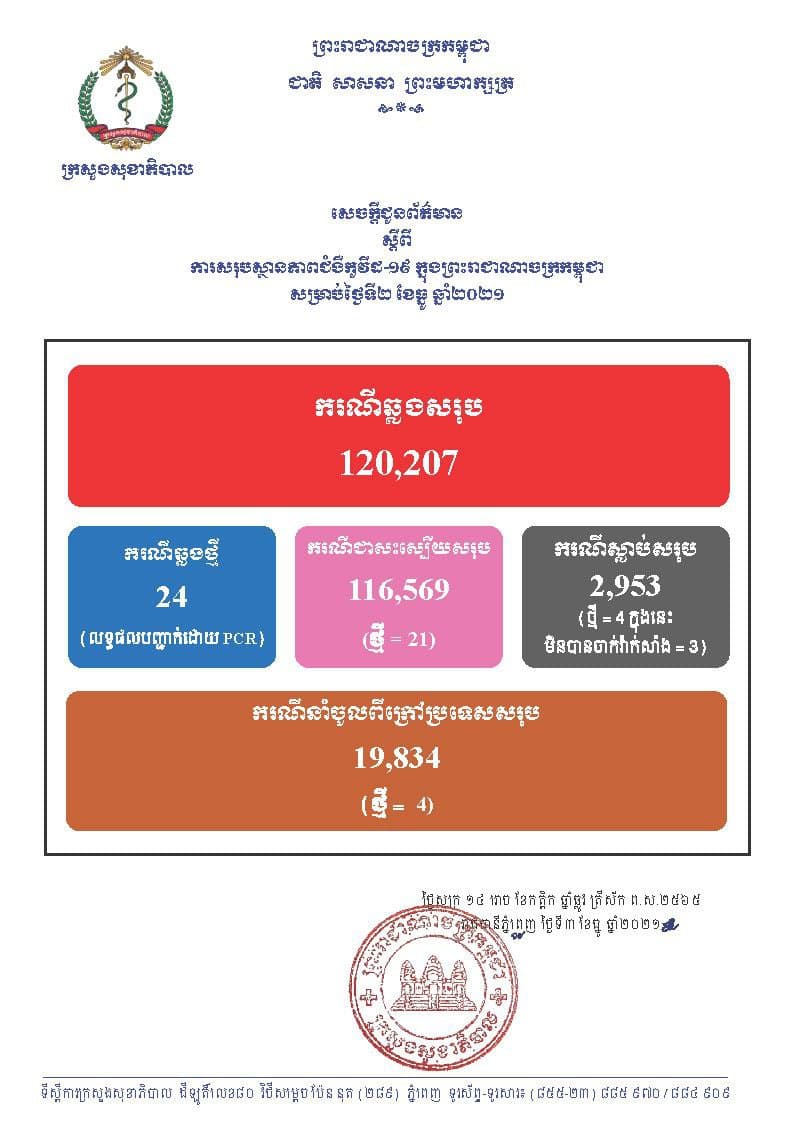 នៅថ្ងៃទី03 ខែធ្នូ ឆ្នាំ2021នេះ ក្រសួងសុខាភិបាលកម្ពុជា បានចេញសេចក្តីជូនដំណឹងពី ការរកឃើញករណីវិជ្ជមានវីរុសកូវីដ១៩ថ្មី ចំនួន 24នាក់ (លទ្ធផលបញ្ជាក់ដោយ PCR) ខណៈអ្នកបានជាសះស្បើយថ្មីមានចំនួន 21នាក់ និងមានអ្នកបាត់បង់ជីវិតថ្មី 4នាក់(មិនបានចាក់វ៉ាក់សាំង 3នាក់) គិតមកទល់ពេលនេះ ករណីឆ្លងកូវីដ១៩ សរុបនៅក្នុងប្រទេសកម្ពុជា មានចំនួន 120,207នាក់, ករណីជាសះស្បើយសរុប 116,569នាក់ និងស្លាប់សរុប 2,953នាក់៕