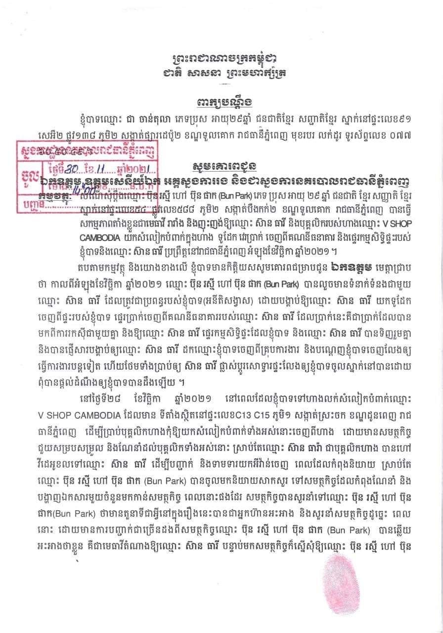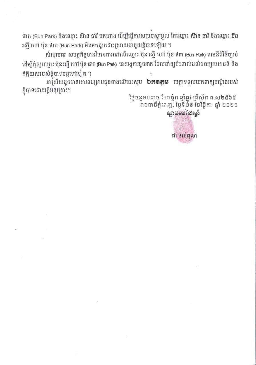 ក្នុងនោះផងដែរលោក ប៊ុន ផាក ក៏ត្រូវបានរងពាក្យបណ្តឹងពីបុរសម្នាក់ឈ្មោះ ជា ចាន់តុលា ដោយប្តឹងលោកថាញោះញ៉ុង អោយប្រពន្ធរបស់ខ្លួន (អនីតិសង្វាស) ឈ្មោះ ស៊ាន ធារី យកសំលៀកបំពាក់ក្នុងហាង ទូដែក វេរប្រាក់ចេញពីធនាគារ និងផ្ទេរកម្មសិទ្ធិផ្ទះ។ រឿងរ៉ាវលំអិតនឹងធ្វើការជូនដំណឹងនាពេលក្រោយទៀត៕