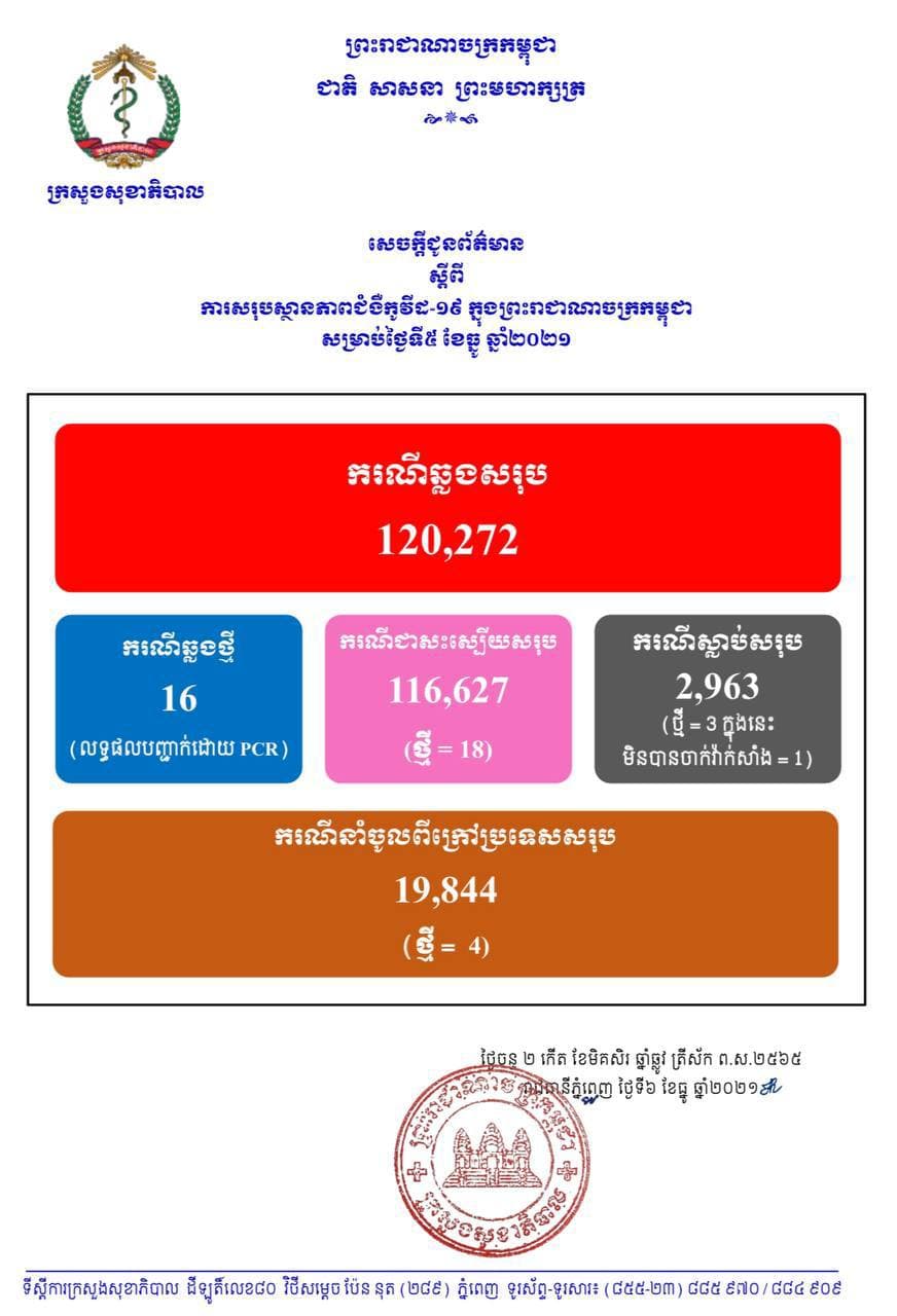 នៅថ្ងៃទី06 ខែធ្នូ ឆ្នាំ2021នេះ ក្រសួងសុខាភិបាលកម្ពុជា បានចេញសេចក្តីជូនដំណឹងពី ការរកឃើញករណីវិជ្ជមានវីរុសកូវីដ១៩ថ្មី ចំនួន 16នាក់ (លទ្ធផលបញ្ជាក់ដោយ PCR) ខណៈអ្នកបានជាសះស្បើយថ្មីមានចំនួន 18នាក់ និងមានអ្នកបាត់បង់ជីវិតថ្មី 3នាក់(មិនបានចាក់វ៉ាក់សាំង 1នាក់) គិតមកទល់ពេលនេះ ករណីឆ្លងកូវីដ១៩ សរុបនៅក្នុងប្រទេសកម្ពុជា មានចំនួន 120,272នាក់, ករណីជាសះស្បើយសរុប 116,627នាក់ និងស្លាប់សរុប 2,963នាក់៕
