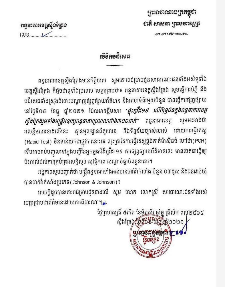ពន្ធនាគារខេត្តស្ទឹងត្រែង សូមធ្វើការបំភ្លឺ និងបដិសេធទាំងស្រុងចំពោះបណ្ដញផ្សព្វផ្សាយព័ត៌មាន និងគេហទំព័រមួយចំនួន បានធ្វើការផ្សព្វផ្សាយនៅថ្ងៃទី០៩ ខែធ្នូ ឆ្នាំ២០២១ ដែលមានខ្លឹមសារ “ផ្ទុះកូវីដ-១៩ លើពិរុទ្ធជនក្នុងពន្ធនាគារខេត្តស្ទឹងត្រែងរួមទាំងមន្ត្រីអនុរក្សពន្ធនាគារប្រមាណជាង ៣០០នាក់” ពន្ធនាគារខេត្ត សូមអះអាងថា រាលខ្លឹមសារខាងលើនេះ គ្មានមូលដ្ឋានពីតួរលេខ និងទិន្នន័យច្បាស់លាស់ ដោយការធ្វើតេស្ត (Rapit Test) មិនទាន់យកជាផ្លូវការនោះទេ លុះត្រាតែការធ្វើតេស្តឆ្លងកាត់ម៉ាស៊ីនធំ ហៅថា (PCR) ទើបអាចរាប់បញ្ចូលទៅក្នុងបញ្ចីនៃអ្នកឆ្លងជំងឺកូវីដ-១៩ ការផ្សព្វផ្សាយព័ត៌មាននេះ មានចេតនាធ្វើឲ្យប៉ះពាល់ដល់ការគ្រប់គ្រងសន្តិសុខ សុវត្ថិភាព សណ្ដាប់ធ្នាប់ពន្ធនាគារ។