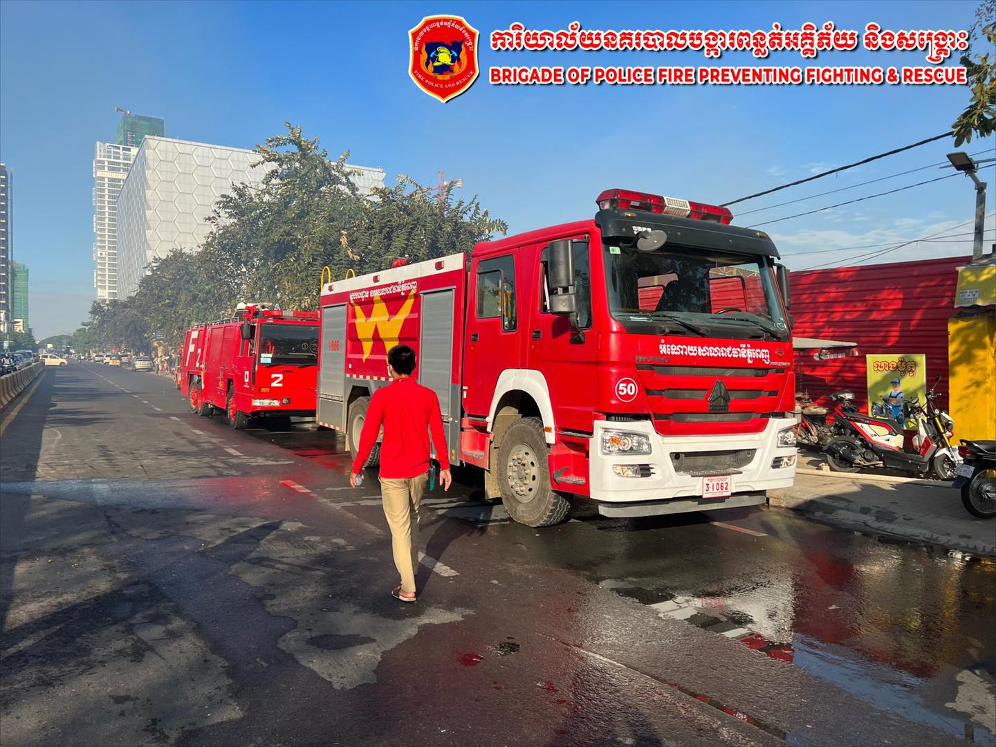 លោកវរសេនីយ៍ឯក ព្រហ្ម យ៉ន នាយការិយាល័យ បានបន្តទៀតថា សម្រាប់ប្រតិបត្តិការសង្គ្រោះវិញ កម្លាំងជំនាញរបស់យើងបានប្រើប្រាស់រថយន្ដការិយាល័យបង្ការ និងពន្លត់អគ្គិភ័យ ចំនួន ៤៨គ្រឿង ប្រើប្រាស់ទឹកអស់ ៩៨ឡាន ស្មើរនឹង ៣៩២ម៉ែត្រគូប និងរថយន្តពន្លត់អគ្គិភ័យជំនួយរបស់ក្រសួងមហាផ្ទៃ ចំនួន ៦គ្រឿង ប្រើប្រាស់ទឹកអស់ ៨ឡាន ស្មើរនឹង ៤៤ម៉ែត្រគូប, រថយន្តពន្លត់អគ្គិភ័យ អង្គភាព ង៧០ ចំនួន ៤គ្រឿង ស្មើរនឹង ២០ម៉ែត្រគូប, រថយន្តពន្លត់អគ្គិភ័យ OCIC ទីក្រុងជ្រោយចង្វារ ចំនួន ១៤គ្រឿង ប្រើប្រាស់ទឹកអស់ ២៧ឡាន ស្មើរនឹង ១០៨ម៉ែត្រគូប, រថយន្តពន្លត់អគ្គិភ័យ OCIC ទីក្រុងកោះពេជ្រ ចំនួន ៣គ្រឿង ប្រើប្រាស់ទឹកអស់ ៩ឡាន ស្មើរនឹង ៣៦ម៉ែត្រគូប, រថយន្តពន្លត់អគ្គិភ័យទីក្រុង អូឡាំព្យា ចំនួន ៦គ្រឿង ប្រើប្រាស់ទឹកអស់ ២៤ម៉ែត្រគូប, រថយន្តពន្លត់អគ្គិភ័យរបស់ក្រុមហ៊ុន ស្រាបៀរកម្ពុជា ចំនួន ១គ្រឿង ប្រើប្រាស់ទឹកអស់ ៣ឡាន ស្មើរនឹង ១២ម៉ែត្រគូប, រថយន្តពន្លត់អគ្គិភ័យរបស់ក្រុមហ៊ុន Ganzberg ចំនួន ១គ្រឿង ប្រើប្រាស់ទឹកអស់ ២ឡាន ស្មើរនឹង ៨ម៉ែត្រូគូប, រថយន្តពន្លត់អគ្គិភ័យរបស់សាលាខណ្ឌឫស្សីកែវ ចំនួន ១គ្រឿង ប្រើប្រាស់ទឹកអស់ ១ឡាន ស្មើរនឹង ៤ម៉ែត្រគូប, អូប័រការិយាល័យនគរបាលចរាចរណ៍ជើងទឹក ចំនួន ២គ្រឿង និងទូកម៉ាស៊ីនបូមទឹកសាលាសង្កាត់ច្រាំងចំរេះទី២ ចំនួន ១គ្រឿង ទើបរលត់ទាំងស្រុង នៅវេលាម៉ោង ៩និង៤៥នាទីនាថ្ងៃដដែរ៕