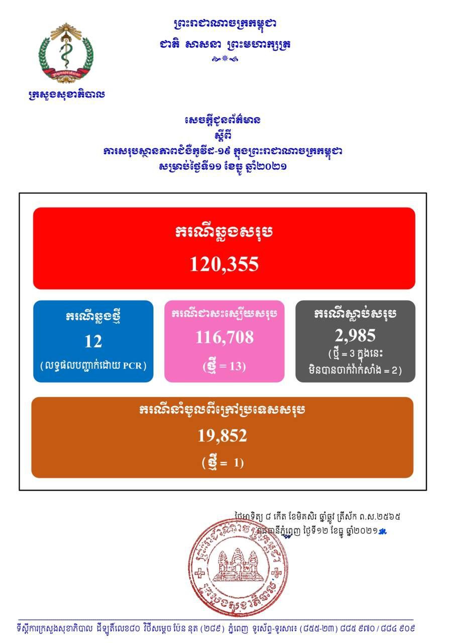 នៅថ្ងៃទី12 ខែធ្នូ ឆ្នាំ2021នេះ ក្រសួងសុខាភិបាលកម្ពុជា បានចេញសេចក្តីជូនដំណឹងពី ការរកឃើញករណីវិជ្ជមានវីរុសកូវីដ១៩ថ្មី ចំនួន 12នាក់ (លទ្ធផលបញ្ជាក់ដោយ PCR) ខណៈអ្នកបានជាសះស្បើយថ្មីមានចំនួន 13នាក់ និងមានអ្នកបាត់បង់ជីវិតថ្មី 3នាក់(មិនបានចាក់វ៉ាក់សាំង 2នាក់) គិតមកទល់ពេលនេះ ករណីឆ្លងកូវីដ១៩ សរុបនៅក្នុងប្រទេសកម្ពុជា មានចំនួន 120,355នាក់, ករណីជាសះស្បើយសរុប 116,708នាក់ និងស្លាប់សរុប 2,985នាក់៕