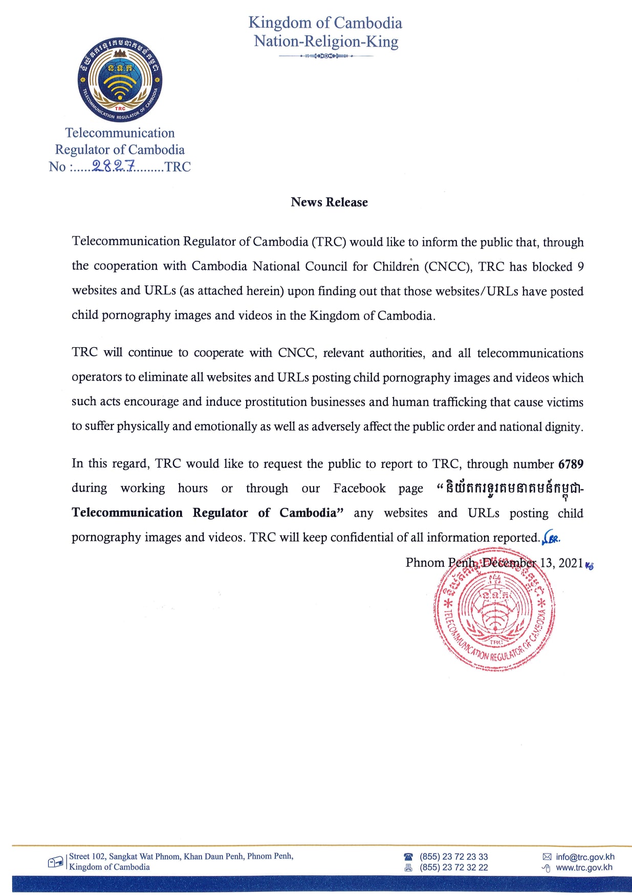 និយ័តករទូរគមនាគមន៍កម្ពុជា និងបន្តសហការជាមួយក្រុមប្រឹក្សាជាតិកម្ពុជា ដើម្បីកុមារ អាជ្ញាធរពាក់ព័ន្ធ និងប្រតិបត្តិការទូរគមនាគមន៍ទាំងអស់ ដើម្បីលុបបំបាត់រាល់គេហទំព័រ និងយូអអិល ដែលបង្ហោះរូបភាព និងវីដេអូអាសអាភាសកុមារតាមប្រព័ន្ធអនឡាញ ដែលសកម្មភាពនេះ បានជំរុញ និងបង្កឲ្យកើតមានអាជីវកម្មពេស្យាកម្ម និងការជួញដូរមនុស្ស ដែលបង្កនូវការឈឺចាប់ទាំងផ្លូវកាយ និងផ្លូវចិត្តដល់ជនរងគ្រោះ ព្រមទាំងប៉ះពាល់យ៉ាងធ្ងន់ធ្ងរដល់សណ្តាប់ធ្នាប់សាធារណៈ និងសេចក្តីថ្លៃថ្នូររបស់ប្រទេសជាតិ។ គេហទំព័រ និងយូអអិលទាំង៩ នោះរួមមានដូចខាងក្រោម៖