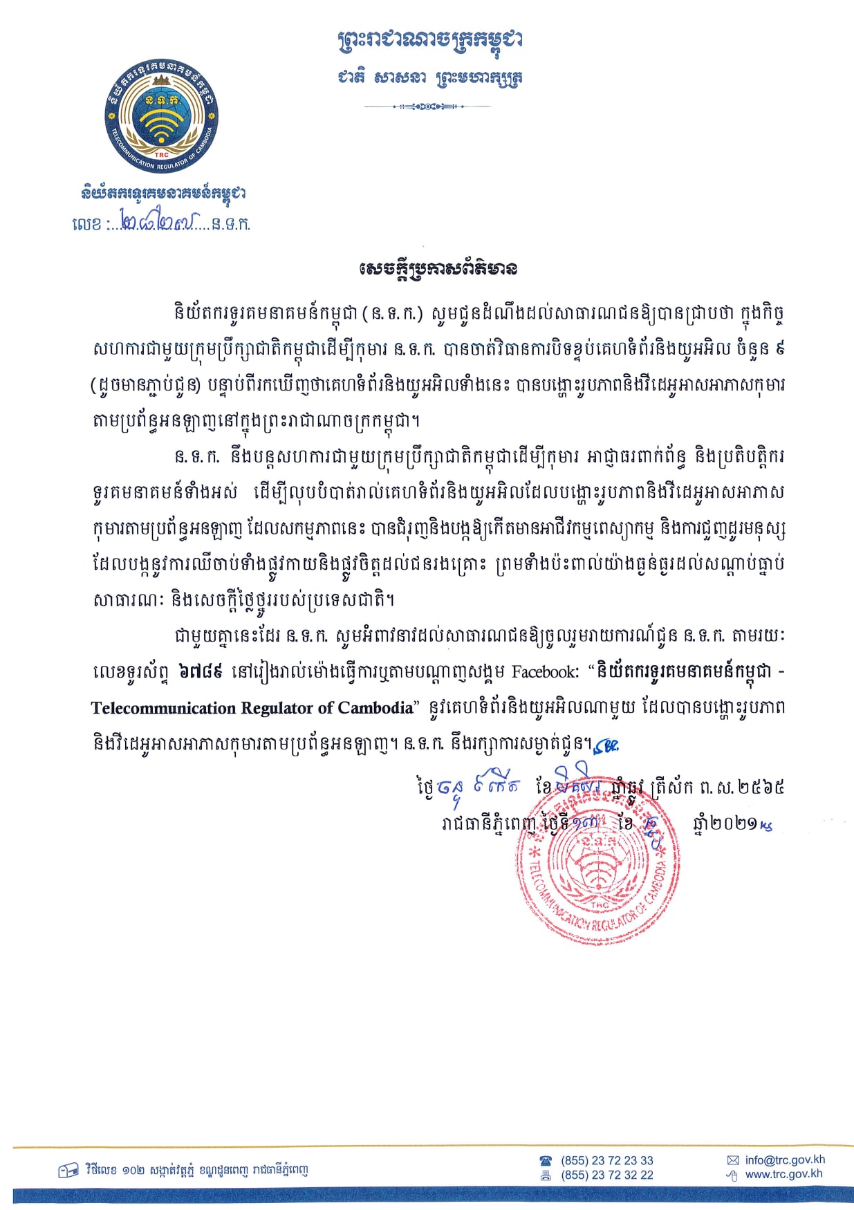 យោងតាមការបញ្ជាក់ពី និយ័តករទូរគមនាគមន៍កម្ពុជា បានឲ្យដឹងថា ក្នុងកិច្ចសហការជាមួយក្រុមប្រឹក្សាជាតិកម្ពុជា ដើម្បីកុមារ និយ័តករទូរគមនាគមន៍កម្ពុជា បានចាត់វិធានការបិទខ្ទប់គេហទំព័រ និងយូអអិលចំនួន ៩ បន្ទាប់ពីរកឃើញថា គេហទំព័រ និងយូអអិលទាំងនេះ បានបង្ហោះរូបភាព និងវីដេអូអាសអាភាសកុមារតាមប្រព័ន្ធអនឡាញនៅក្នុងព្រះរាជាណាចក្រកម្ពុជា។