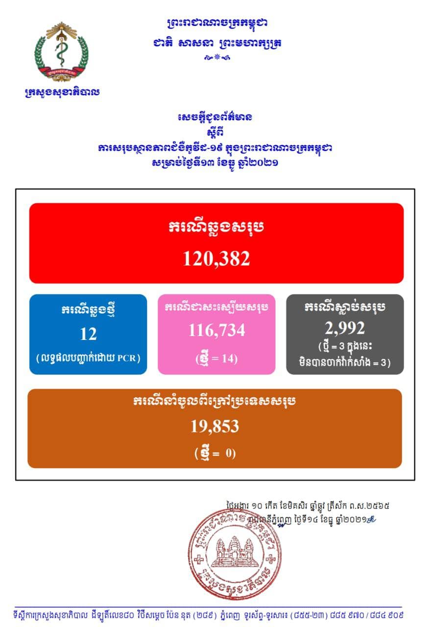 នៅថ្ងៃទី14 ខែធ្នូ ឆ្នាំ2021នេះ ក្រសួងសុខាភិបាលកម្ពុជា បានចេញសេចក្តីជូនដំណឹងពី ការរកឃើញករណីវិជ្ជមានវីរុសកូវីដ១៩ថ្មី ចំនួន 12នាក់ (លទ្ធផលបញ្ជាក់ដោយ PCR) ខណៈអ្នកបានជាសះស្បើយថ្មីមានចំនួន 14នាក់ និងមានអ្នកបាត់បង់ជីវិតថ្មី 3នាក់(មិនបានចាក់វ៉ាក់សាំង 3នាក់) គិតមកទល់ពេលនេះ ករណីឆ្លងកូវីដ១៩ សរុបនៅក្នុងប្រទេសកម្ពុជា មានចំនួន 120,382នាក់, ករណីជាសះស្បើយសរុប 116,734នាក់ និងស្លាប់សរុប 2,992នាក់៕
