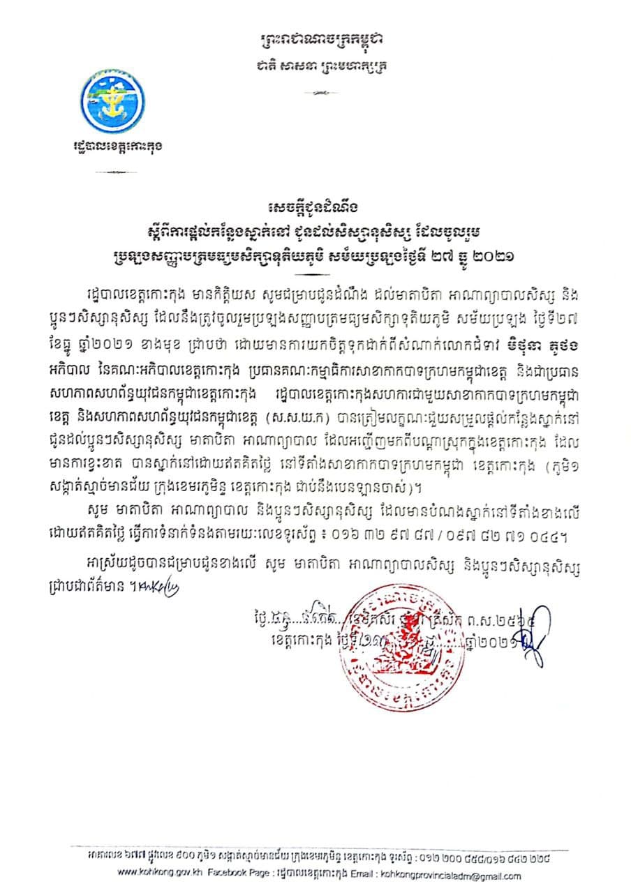 ខេត្តកោះកុង៖ យោងតាមការចុះផ្សាយរបស់ រដ្ឋបាលខេត្តកោះកុង នៅថ្ងៃទី១៤ ខែធ្នូ ឆ្នាំ២០២១ បានចេញសេចក្ដីជូនដំណឹងស្ដីពីការផ្ដល់កន្លែងស្នាក់នៅ ជូនសិស្សានុសិស្ស ដែលចូលរួមប្រឡងសញ្ញាបត្រមធ្យមសិក្សាទុតិយភូមិ សម័យប្រឡងថ្ងៃទី២៧ ខែធ្នូ ឆ្នាំ២០២១ ខាងមុខជ្រាបថា៖