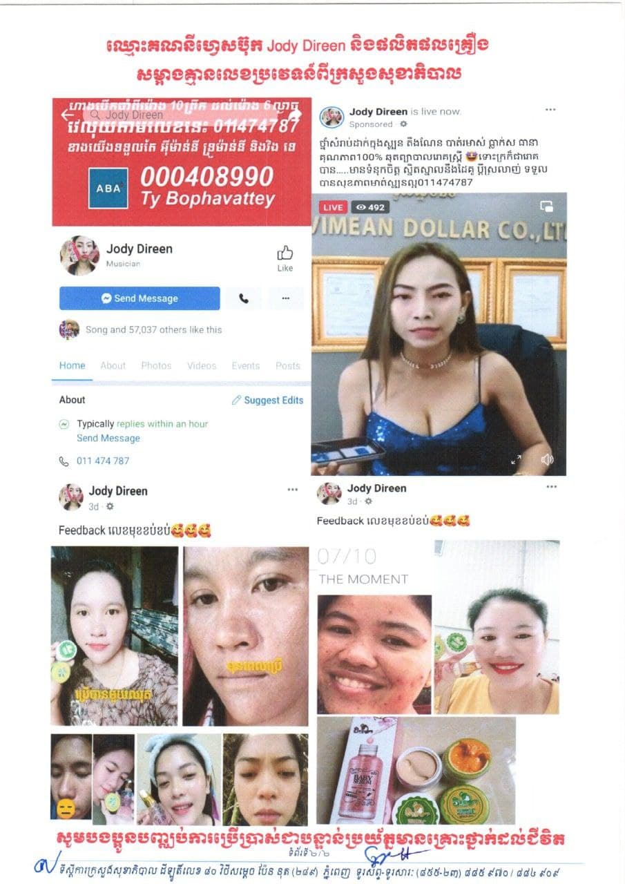 ក្រសួងសុខាភិបាល ហាមឃាត់គណនីហ្វេសប៊ុកទាំងនេះដែលកំពុងផ្សព្វផ្សាយ លក់ផលិតផលគ្មានលេខបញ្ជិកាពីក្រសួងសុខាភិបាល