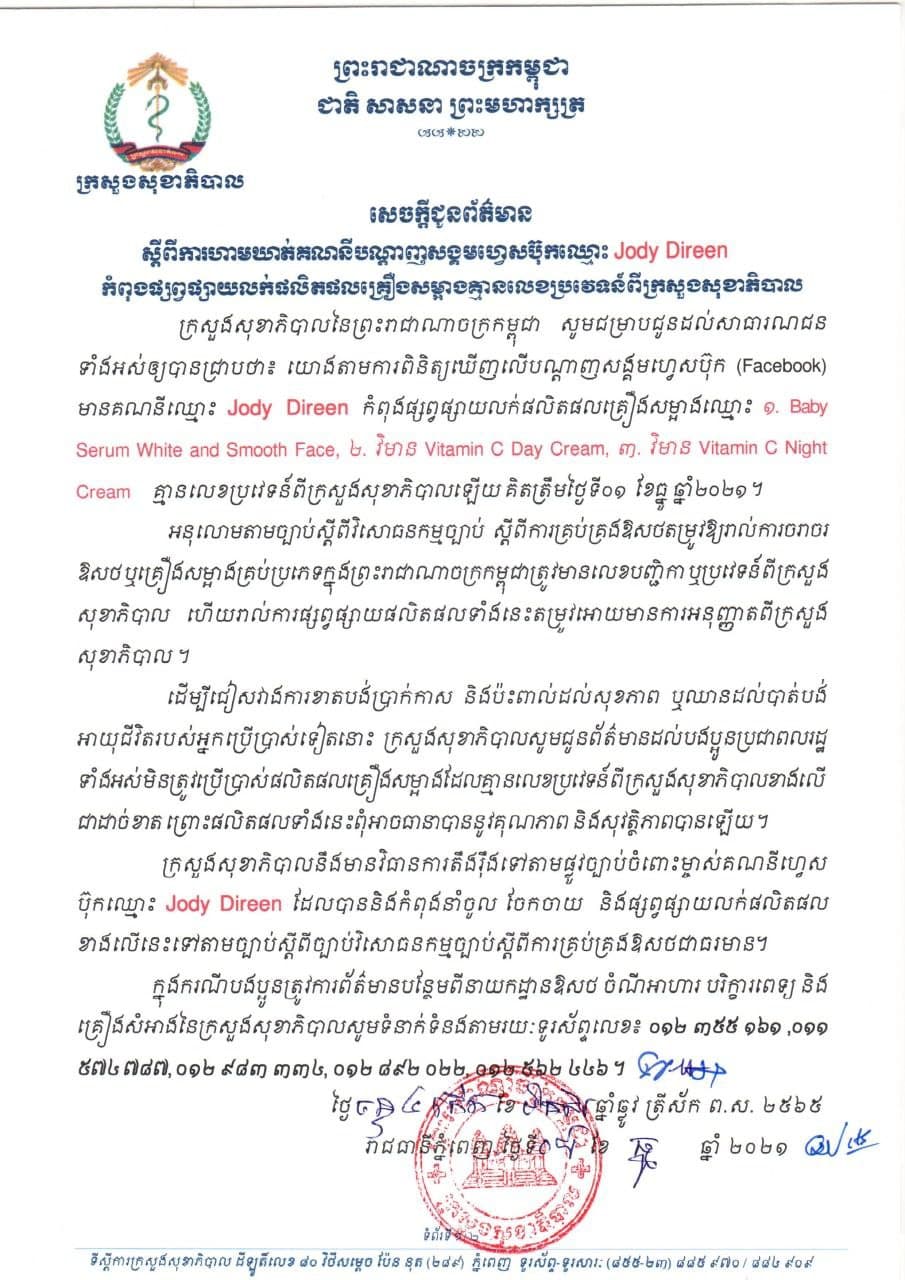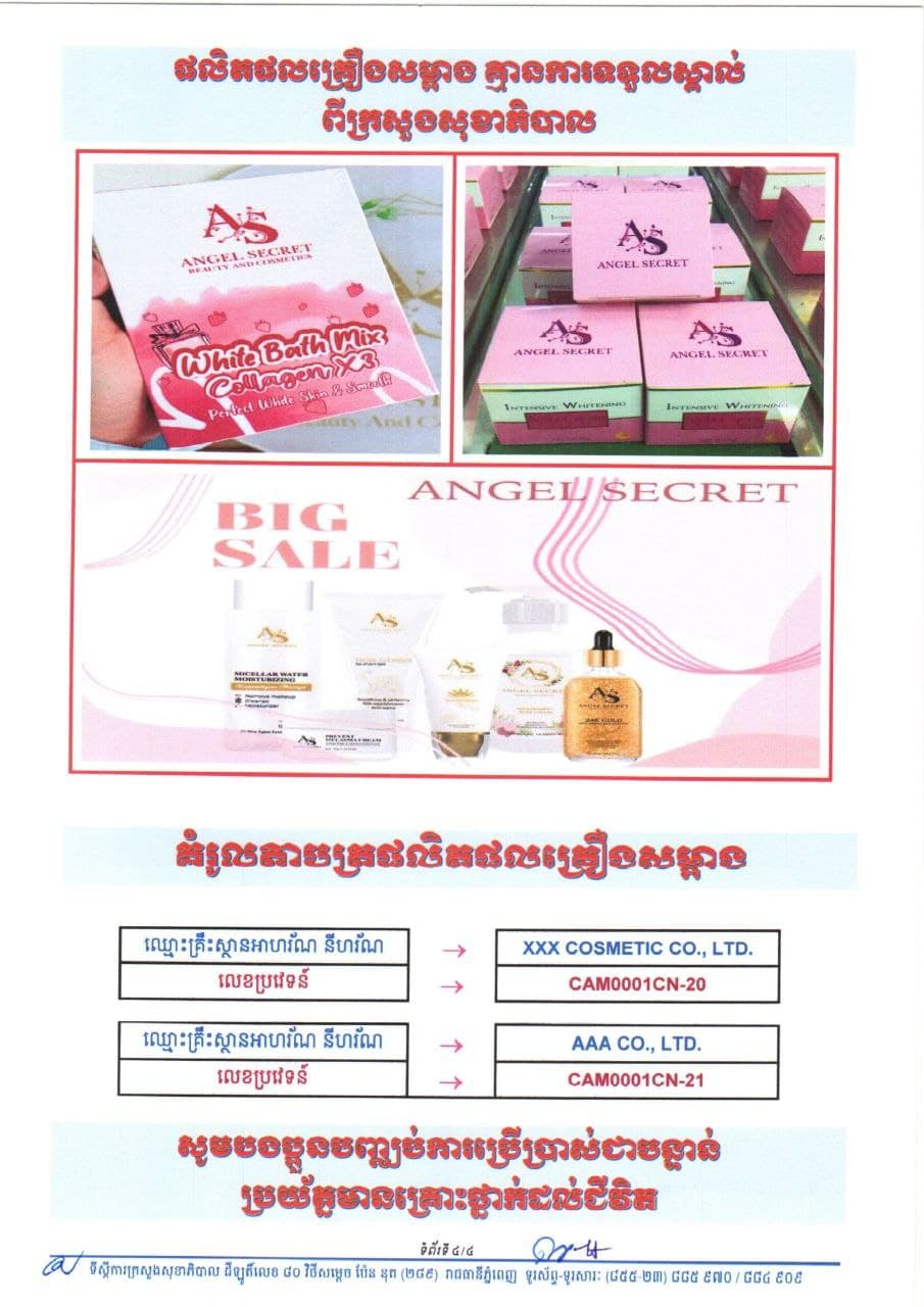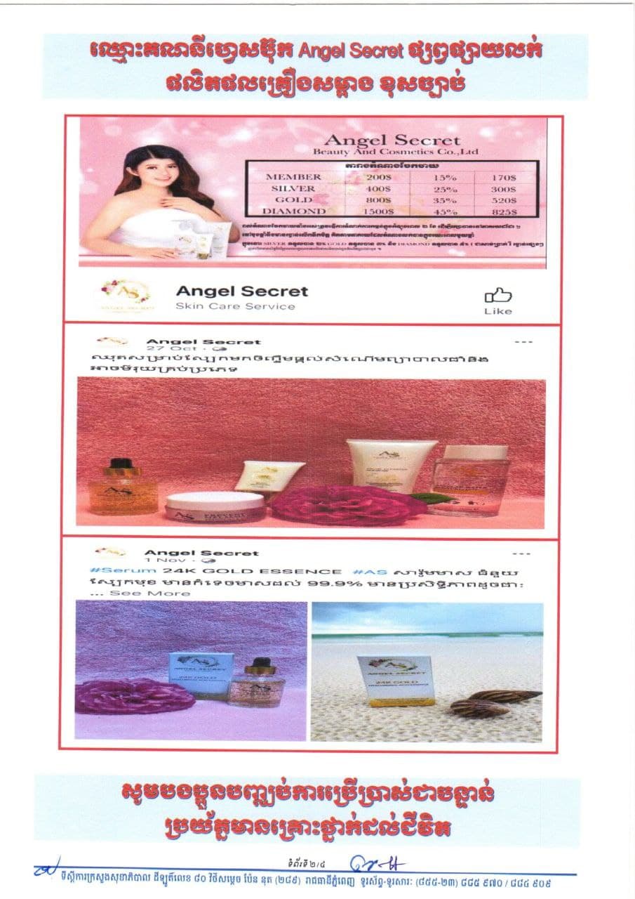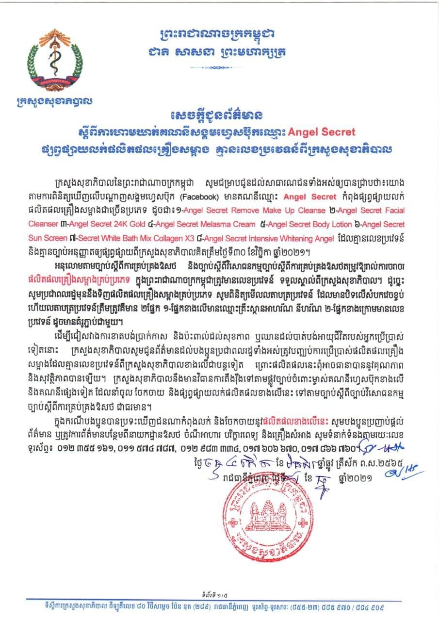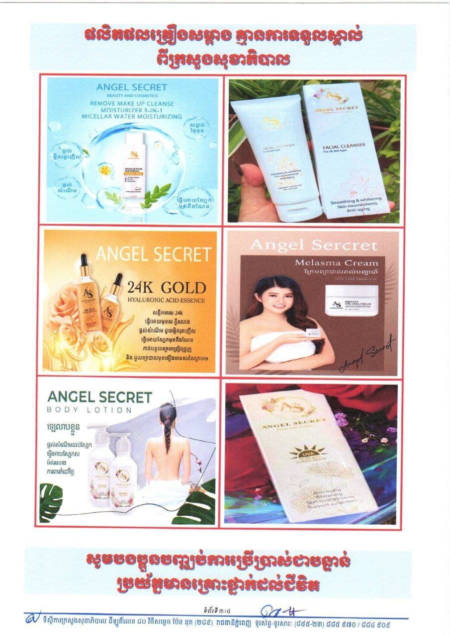 យោងតាមការពិនិត្យឃើញលើបណ្ដាញសង្គមហ្វេស ប៊ុក មានគណនីឈ្មោះ Angel Secret កំពុងផ្សព្វផ្សាយលក់ផលិតផលគ្រឿងសម្អាងជាច្រើនប្រភេទ ដូចជា៖ ១.Angel Secret Remove make up Cleanse ២.Angel Secret Facial Cleanser ៣.Angel Secret 24K Gold ៤.Angel Secret Melasma Cream ៥.Angel Secret Body Lotion ៦.Angel Secret Sun Screen ៧.Secret Bath Mix Collagen x3 ៨.Angel Secret Intensive Whitening Angel និងគណនីហ្វេស ប៊ុក មួយទៀតឈ្មោះ Jody Direen កំពុងផ្សព្វផ្សាយលក់ផលិតផលគ្រឿងសម្អាតឈ្មោះ រួមមាន៖ ១.Baby serum White and Smooth Face ២.វិមាន Vitamin C Day Cream ៣.វិមាន Vitamin C Night Cream ដែលគ្មានលេខ ប្រវេទន៍ពីក្រសួងសុខាភិបាលឡើងគិតត្រឹមថ្ងៃ០១ ខែធ្នូ ឆ្នាំ២០២១។