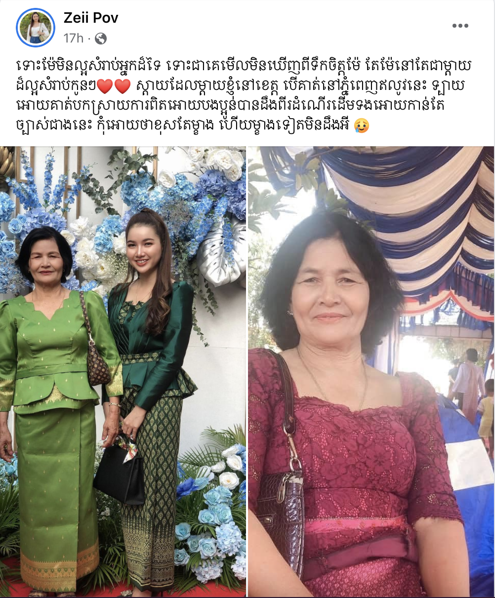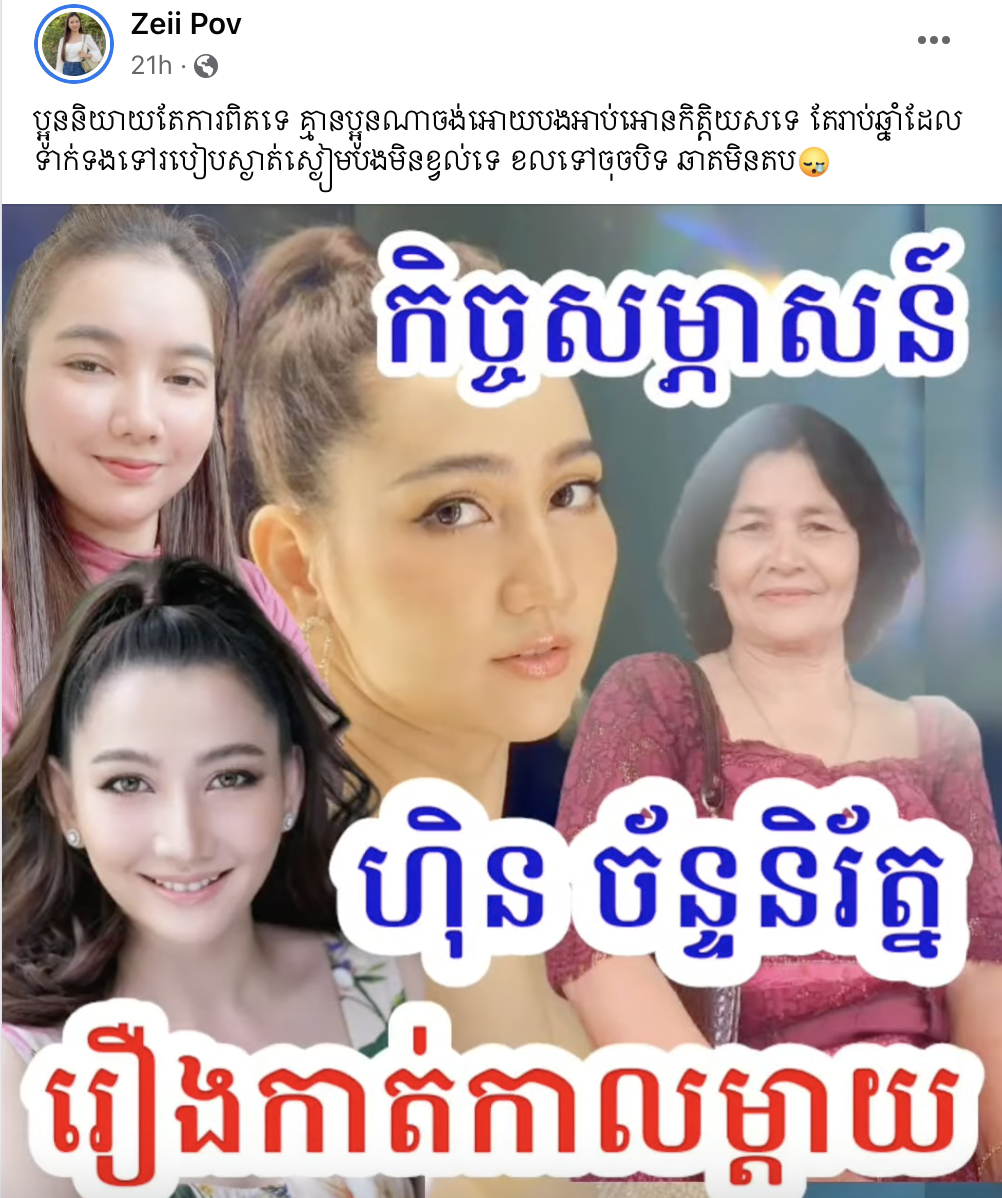 ម្ចាស់គណនីឈ្មោះថា Zeii Pov បានរៀបរាប់នៅលើ Facebook ដោយភ្ជាប់រូបថតម្តាយ និងកញ្ញា ហ៊ិន ចាន់នីរ័ត្ន ថា៖ “ខ្ញុំមិនជឿថា រយៈពេលច្រើនឆ្នាំមកនេះ បងធ្វើដូចជាមិនដឹងរឿងអីនោះទេ បងអាចលាក់បាំងភ្នែកមហាជនបាន អាចកុហកអ្នកគាំទ្របងបាន តែបងមិនអាចលាក់បាំងការពិត នឹងប្រវត្តិរបស់ខ្លួនឯងបានមួយជីវិតនោះបានទេ រឹតតែមិនអាចកុហកខ្លួនឯងទៀត។ មិនមែនបំពុលចង់ល្បីទេ តែបងបើកនេត្រាមើលម្តាយយើងផង ហើយគិតមើលម្តងទៀតថាម្តាយរបស់គាត់ចំណាស់ប៉ុន្មានហើយ តើគាត់អាចនៅជាមួយយើងបានប៉ុន្មានឆ្នាំទៀត?។”