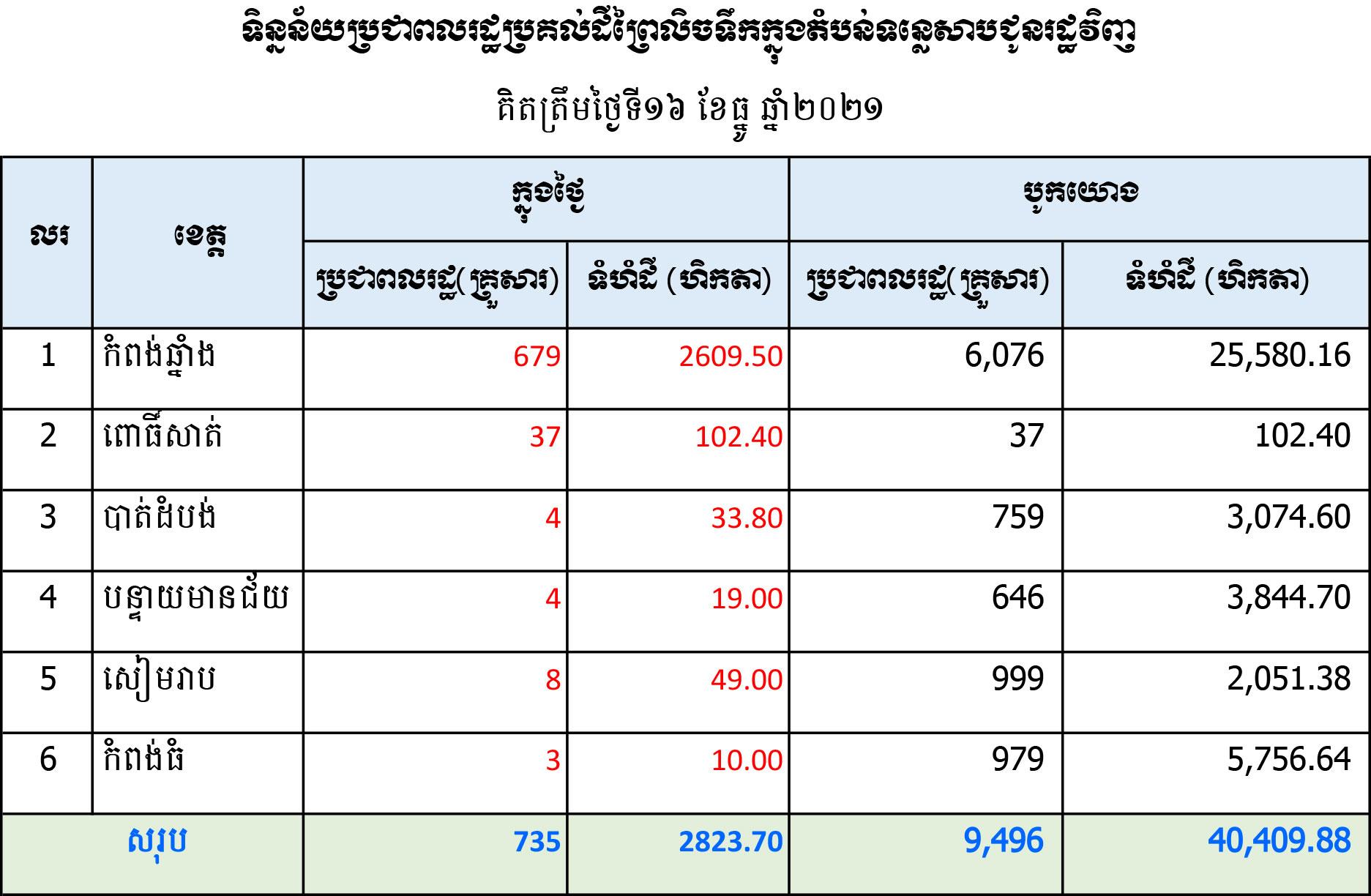 យោងតាមទន្នន័យពលរដ្ឋប្រគល់ដីដែលបានទន្ទ្រានក្នុងតំបន់ទន្លេសាបជាង ៤ម៉ឺនហិកតា ជូនរដ្ឋវិញត្រឹមថ្ងៃទី១៦ ខែធ្នូ ឆ្នាំ២០២១ ក្នុងការអនុវត្តបទបញ្ជារបស់សម្ដេចតេជោ ហ៊ុន សែន នាយករដ្ឋមន្ត្រីនៃកម្ពុជា រយៈពេលជិត៣សប្តាហ៍មកនេះ មានប្រជាពលរដ្ឋចំនួន ៩៤៩៤គ្រួសារ នៅក្នុងខេត្តចំនួន៦ បានប្រគល់ដីព្រៃលិចទឹកដែលខ្លួនបានទន្ទ្រាននៅជុំវិញបឹងទន្លេសាប ចំនួន ៤០,៤០៩.៨៨ហិកតា ជូនដល់រាជរដ្ឋាភិបាលវិញ ត្រឹមថ្ងៃទី១៦ ខែធ្នូ ឆ្នាំ២០២១នេះ។