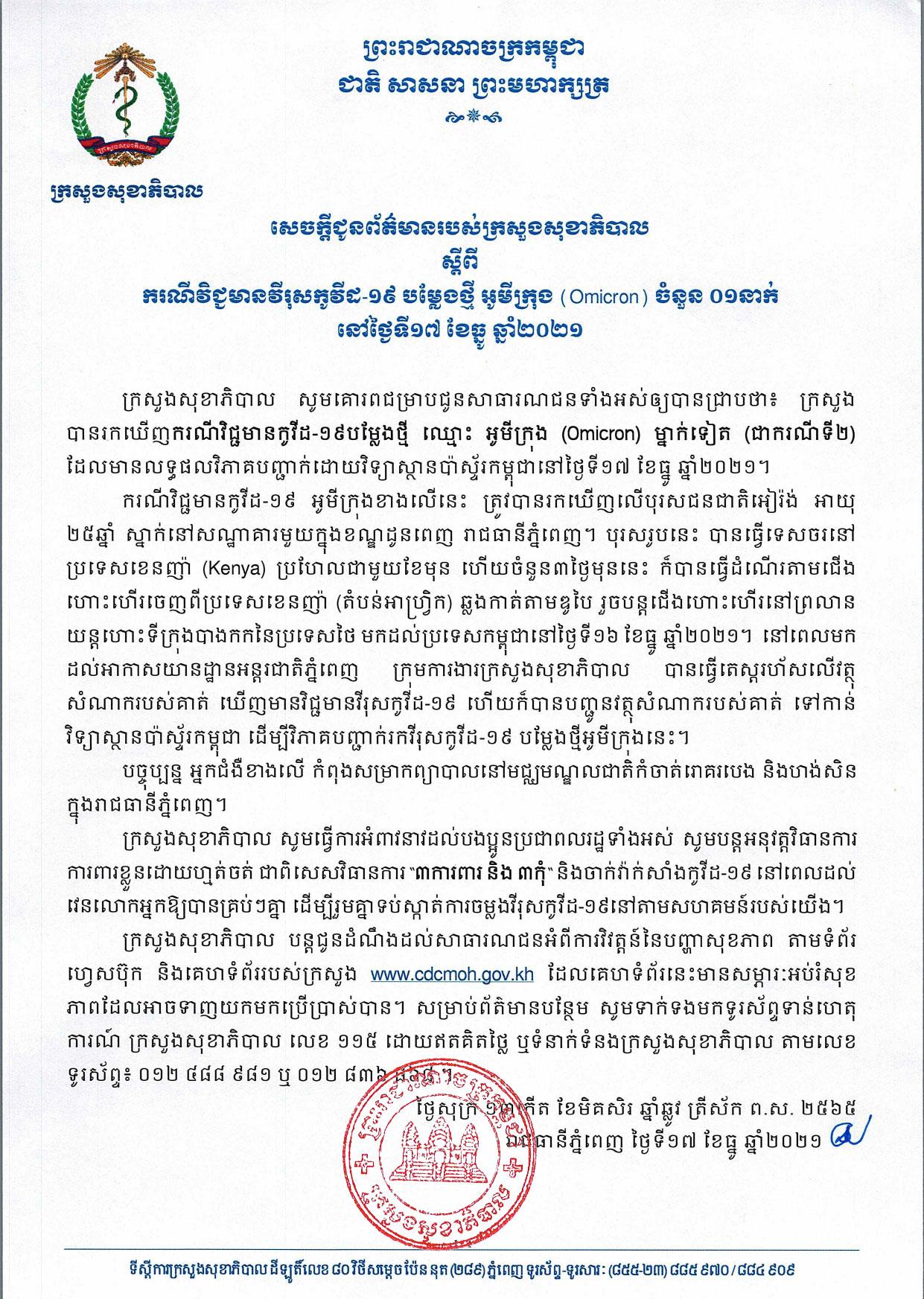 យោងតាមការបញ្ជាក់ពី ក្រសួងសុខាភិបាល បានឲ្យដឹងថា ក្រសួង បានរកឃើញករណីវិជ្ជមានកូវីដ-១៩ បម្លែងថ្មី ឈ្មោះ «អូមីក្រុង» ម្នាក់ទៀត (ជាករណីទី២) ដែលមានលទ្ធផលវិភាគបញ្ជាក់ដោយវិទ្យាស្ថានប៉ាស្ទ័រកម្ពុជានៅថ្ងៃទី១៧ ខែធ្នូ ឆ្នាំ២០២១។