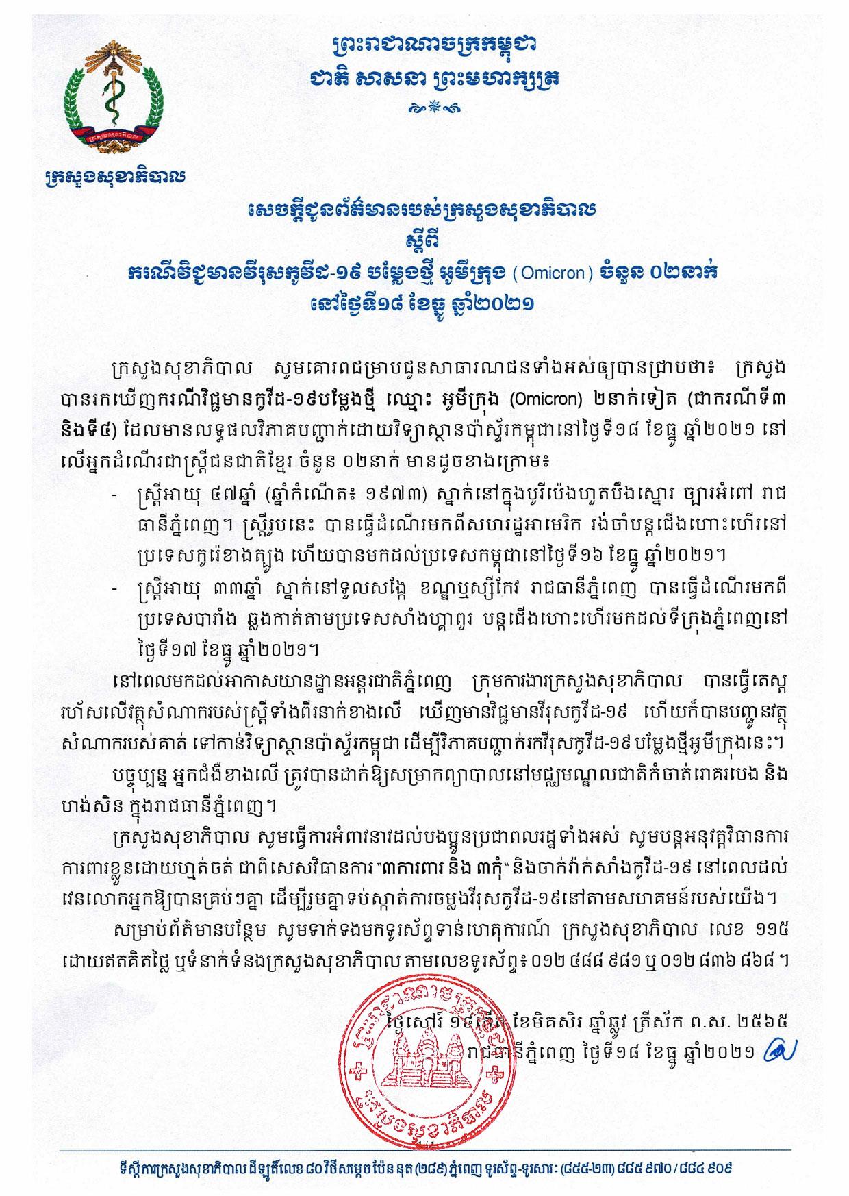 រាជធានីភ្នំពេញ៖ យោងតាមការចុះផ្សាយរបស់ ក្រសួងសុខាភិបាល បានចេញសេចក្ដីជូនព័ត៌មានរបស់ក្រសួងសុខាភិបាលស្ដីពីករណីវិជ្ជមានវីរុសកូវីដ-១៩ បម្លែងថ្មី អូមីក្រុង(Omicron) ចំនួន ០២នាក់នៅថ្ងៃទី១៨ ខែធ្នូ ឆ្នាំ២០២១ ដោយសូមជម្រាបជូនសាធារណជនទាំងអស់ឲ្យបានជ្រាបថា៖