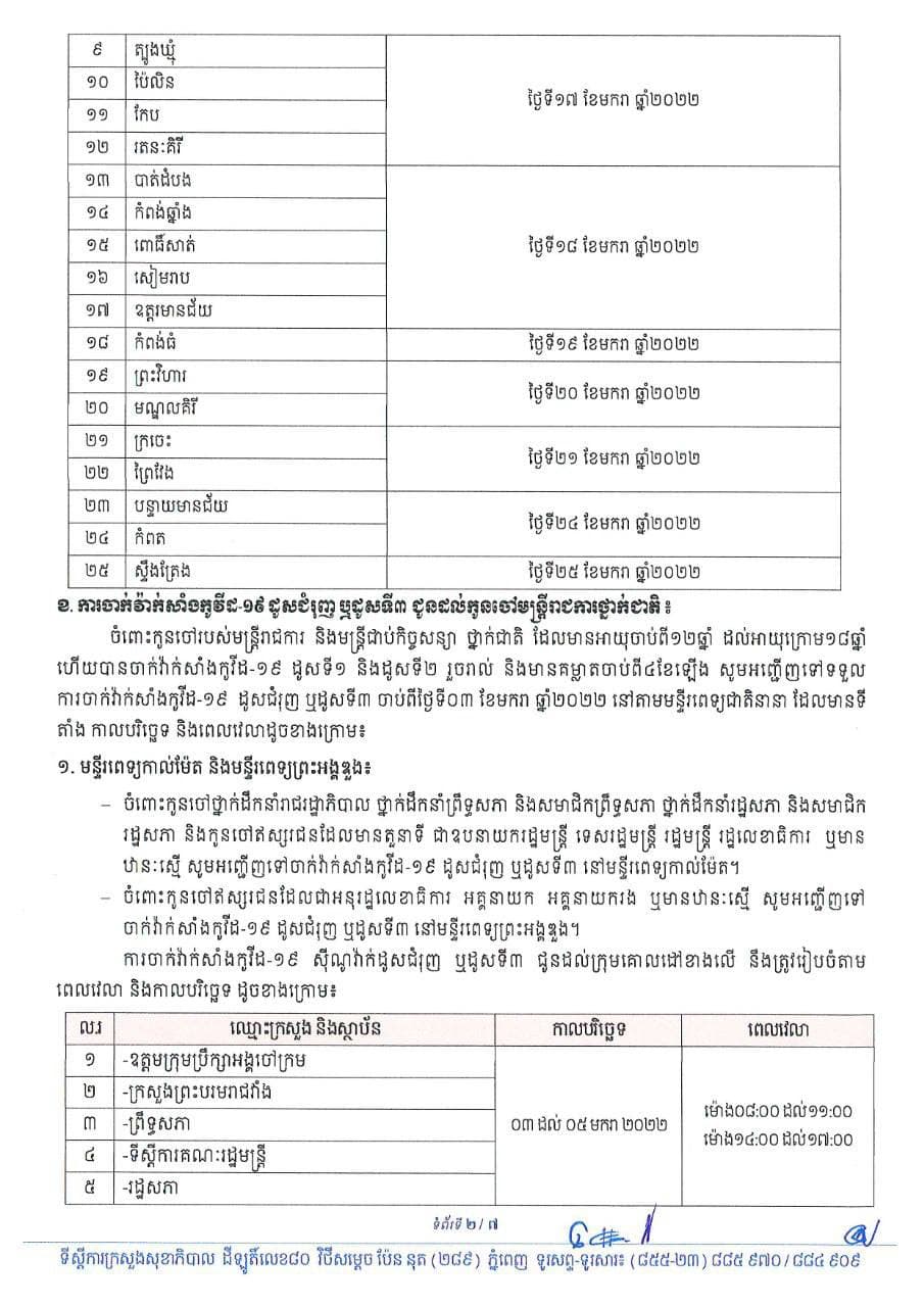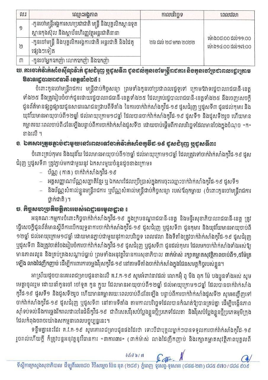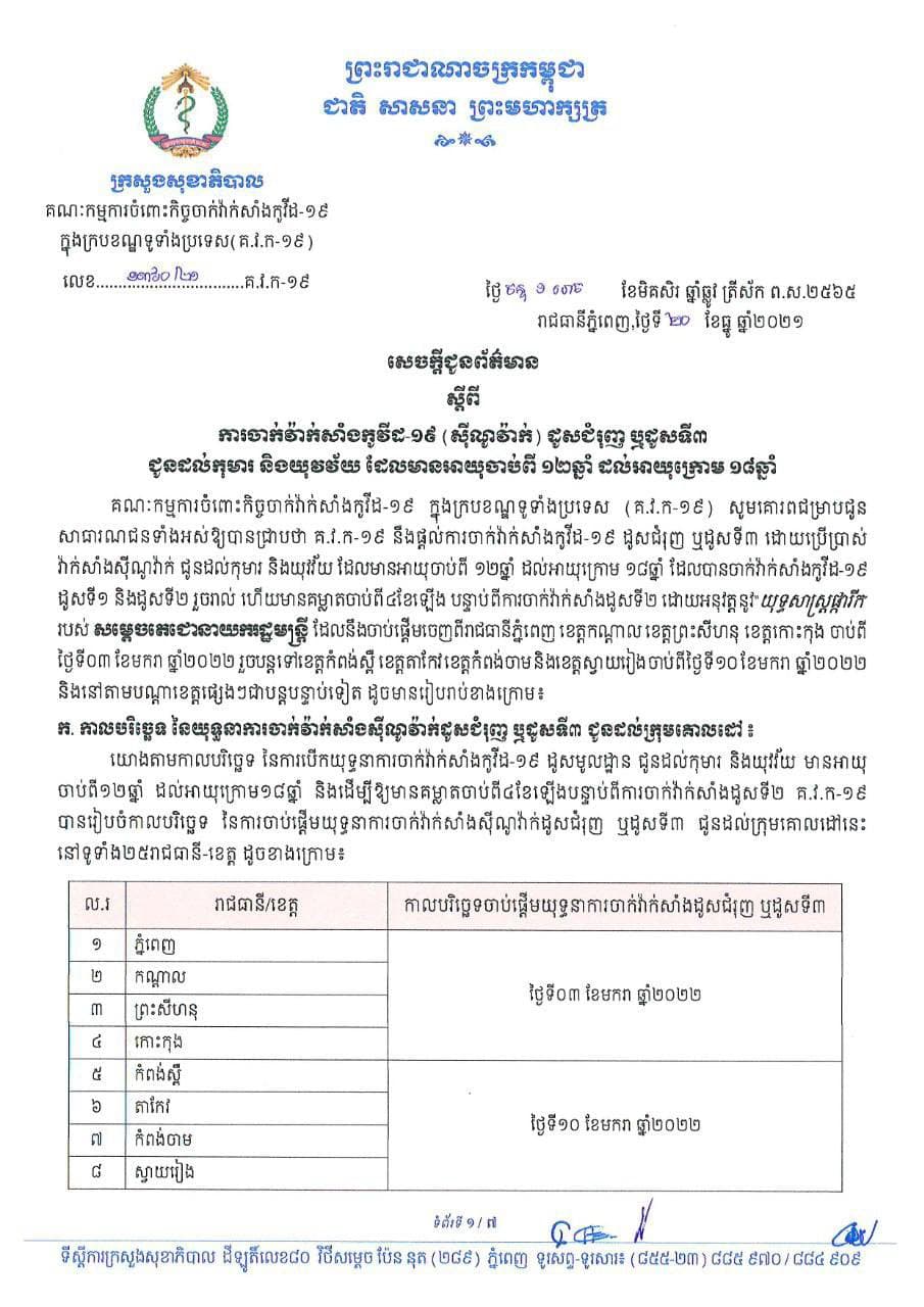 គណៈកម្មការចំពោះកិច្ចចាក់វ៉ាក់សាំងកូវីដ-១៩ ក្នុងក្របខណ្ឌទូទាំងប្រទេស(គ.វ.ក-១៩) សូមជម្រាបជូនសាធារណជនទាំងអស់ឲ្យបានជ្រាបថា គ.វ.ក-១៩ នឹងផ្ដល់ការចាក់វ៉ាក់សាំងកូវីដ-១៩ ដូសជំរុញ ឬដូសទី៣ ដោយប្រើប្រាស់វ៉ាក់សាំងស៊ីណូវ៉ាក់ ជូនកុមារ និងយុវវ័យ ដែលមានអាយុចាប់ពី១២ឆ្នាំ ដល់អាយុក្រោម ១៨ឆ្នាំ ដែលបានចាក់វ៉ាក់សាំងកូវីដ-១៩ ដូសទី១ និងដូសទី២ រួចរាល់ ហើយមានគម្លាតចាប់ពី៤ខែឡើង បន្ទាប់ពីការចាក់វ៉ាក់សាំងដូសទី២ ដោយអនុវត្តនូវ “យុទ្ធសាស្ត្រផ្ការីក” របស់ សម្តេចតេជោនាយករដ្ឋមន្ត្រី ដែលនឹងចាប់ផ្ដើមចេញពីរាជធានីភ្នំពេញ ខេត្តកណ្ដាល ខេត្តព្រះសីហនុ ខេត្តកោះកុង ចាប់ពីថ្ងៃទី០៣ ខែមករា ឆ្នាំ២០២២ រួចបន្តទៅខេត្តកំពង់ស្ពឺ ខេត្តតាកែវ ខេត្តកំពង់ចាម និងខេត្តស្វាយរៀង ចាប់ពីថ្ងៃទី១០ ខែមករា ឆ្នាំ២០២២ និងនៅតាមបណ្ដាលខេត្តផ្សេងៗជាបន្តបន្ទាប់ទៀត ដូចមានរៀបរាប់ខាងក្រោម៖