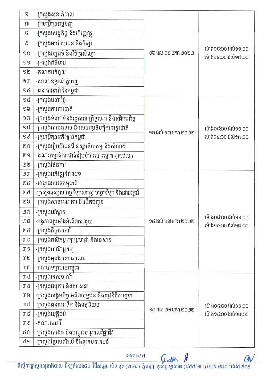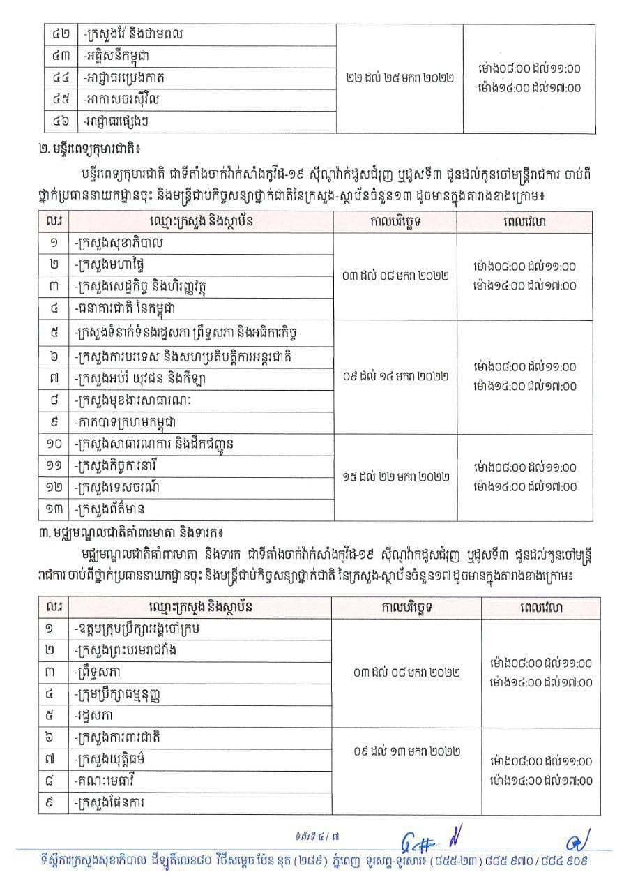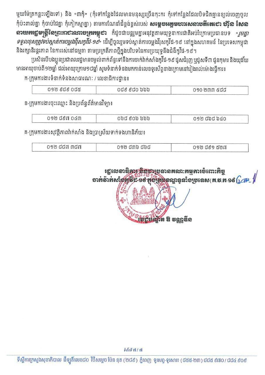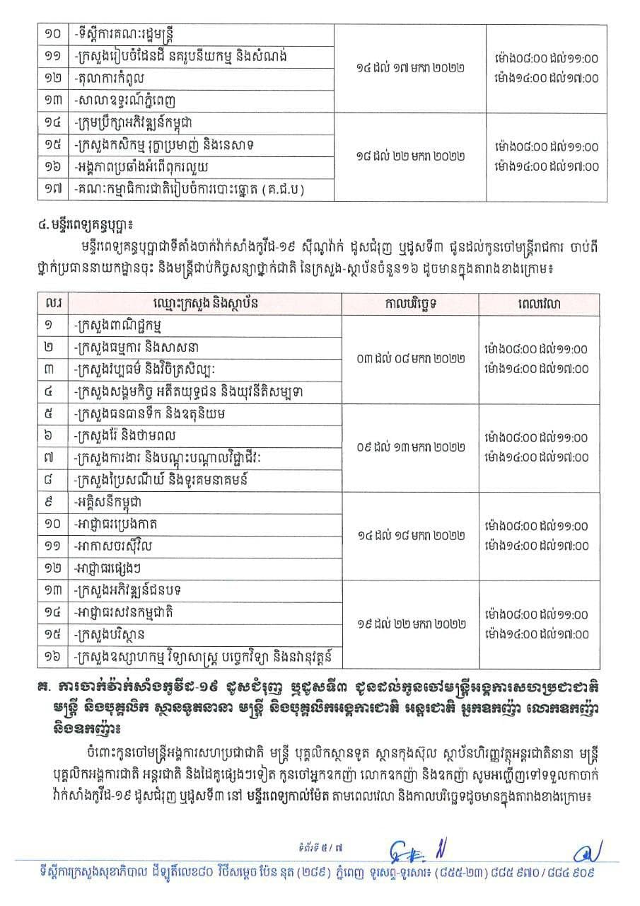 គណៈកម្មការចំពោះកិច្ចចាក់វ៉ាក់សាំងកូវីដ-១៩ ក្នុងក្របខណ្ឌទូទាំងប្រទេស(គ.វ.ក-១៩) សូមជម្រាបជូនសាធារណជនទាំងអស់ឲ្យបានជ្រាបថា គ.វ.ក-១៩ នឹងផ្ដល់ការចាក់វ៉ាក់សាំងកូវីដ-១៩ ដូសជំរុញ ឬដូសទី៣ ដោយប្រើប្រាស់វ៉ាក់សាំងស៊ីណូវ៉ាក់ ជូនកុមារ និងយុវវ័យ ដែលមានអាយុចាប់ពី១២ឆ្នាំ ដល់អាយុក្រោម ១៨ឆ្នាំ ដែលបានចាក់វ៉ាក់សាំងកូវីដ-១៩ ដូសទី១ និងដូសទី២ រួចរាល់ ហើយមានគម្លាតចាប់ពី៤ខែឡើង បន្ទាប់ពីការចាក់វ៉ាក់សាំងដូសទី២ ដោយអនុវត្តនូវ “យុទ្ធសាស្ត្រផ្ការីក” របស់ សម្តេចតេជោនាយករដ្ឋមន្ត្រី ដែលនឹងចាប់ផ្ដើមចេញពីរាជធានីភ្នំពេញ ខេត្តកណ្ដាល ខេត្តព្រះសីហនុ ខេត្តកោះកុង ចាប់ពីថ្ងៃទី០៣ ខែមករា ឆ្នាំ២០២២ រួចបន្តទៅខេត្តកំពង់ស្ពឺ ខេត្តតាកែវ ខេត្តកំពង់ចាម និងខេត្តស្វាយរៀង ចាប់ពីថ្ងៃទី១០ ខែមករា ឆ្នាំ២០២២ និងនៅតាមបណ្ដាលខេត្តផ្សេងៗជាបន្តបន្ទាប់ទៀត ដូចមានរៀបរាប់ខាងក្រោម៖