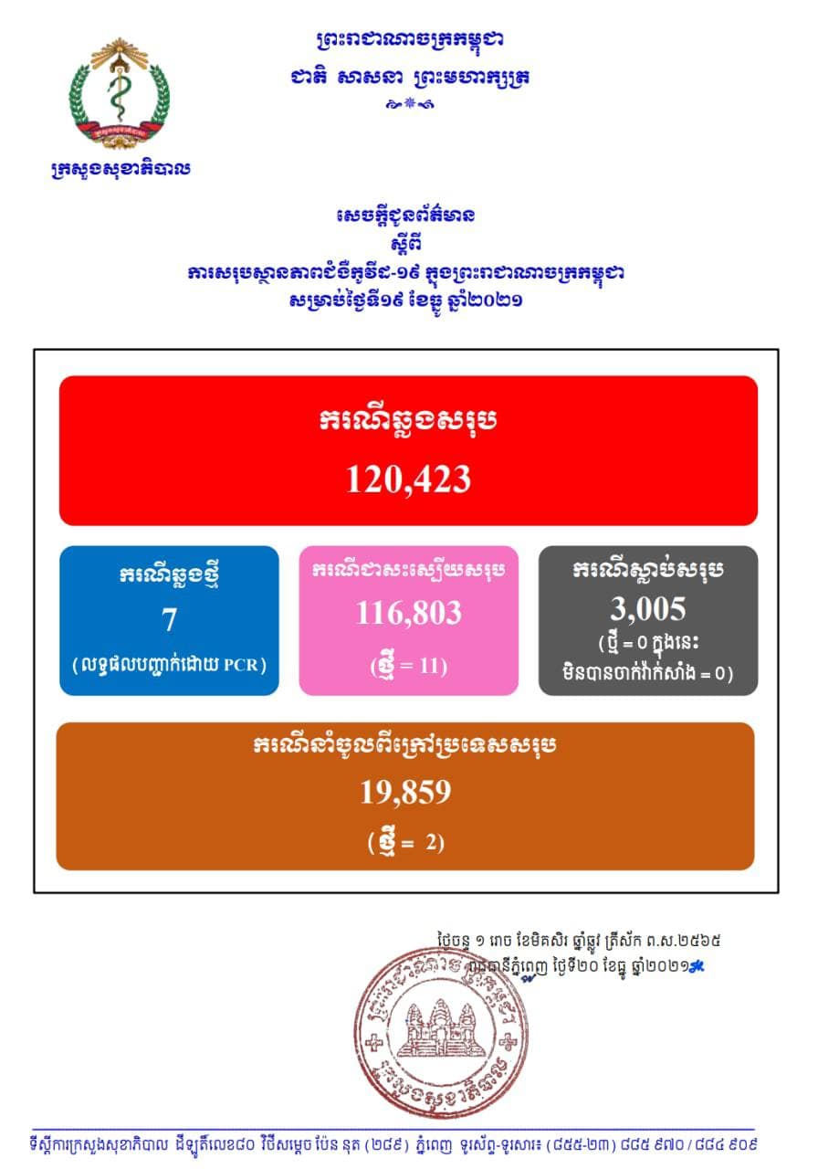នៅថ្ងៃទី20 ខែធ្នូ ឆ្នាំ2021នេះ ក្រសួងសុខាភិបាលកម្ពុជា បានចេញសេចក្តីជូនដំណឹងពី ការរកឃើញករណីវិជ្ជមានវីរុសកូវីដ១៩ថ្មី ចំនួន 07នាក់ (លទ្ធផលបញ្ជាក់ដោយ PCR) ខណៈអ្នកបានជាសះស្បើយថ្មីមានចំនួន 11នាក់ និងមិនមានអ្នកបាត់បង់ជីវិតដោយសារជំងឺកូវីដ-១៩ គិតមកទល់ពេលនេះ ករណីឆ្លងកូវីដ១៩ សរុបនៅក្នុងប្រទេសកម្ពុជា មានចំនួន 120,423នាក់, ករណីជាសះស្បើយសរុប 116,803នាក់ និងស្លាប់សរុប 3,005នាក់៕