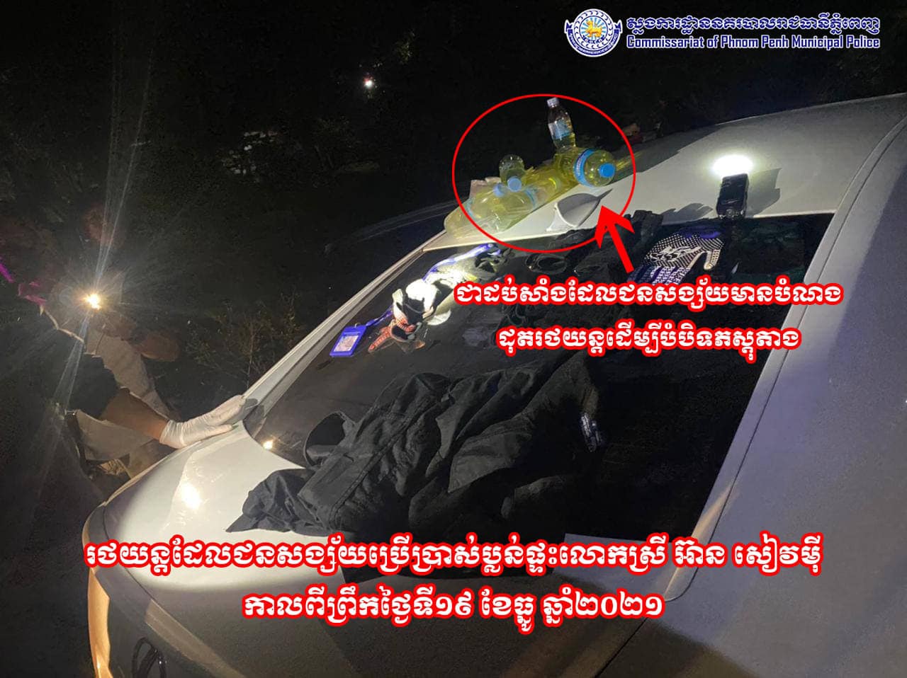 យោងតាមការបញ្ជាក់ពី ស្នងការដ្ឋាននគរបាលរាជធានីភ្នំពេញ បានឲ្យដឹងផងដែរថា ដោយអនុវត្តតាមបទបញ្ជារបស់ឯកឧត្តម នាយឧត្តមសេនីយ៍ សន្តិបណ្ឌិត នេត សាវឿន អគ្គស្នងការននគរបាលជាតិ ឯកឧត្តម ឧត្តមសេនីយ៍ឯក ស ថេត អគ្គស្នងការរង និងជាស្នងការនគរបាលរាជធានីភ្នំពេញ និងនាយកដ្ឋានជំនាញពាក់ព័ន្ធ កម្លាំងការិយាល័យព្រហ្មទណ្ឌកម្រិតធ្ងន់នៃស្នងការដ្ឋាននគរបាលរាជធានីភ្នំពេញ កម្លាំងនៃអធិការដ្ឋាននគរបាលខណ្ឌដង្កោ សហការជាមួយកម្លាំងនាយកដ្ឋានព្រហ្មទណ្ឌ បានស្រាវជ្រាវ និងដេញឃាត់បានរថយន្តដែលជនសង្ស័យបានប្រើប្រាស់ក្នុងករណីប្លន់កាលពីព្រឹកថ្ងៃទី១៩ ខែធ្នូ ឆ្នាំ២០២១ នៅក្នុងបុរីញូថោន ខណ្ឌពោធិ៍សែនជ័យ ។ ដោយស្ថានភាពងងឹតខ្លាំង កម្លាំងជំនាញបានប្រដេញរថយន្តនេះ រហូតជនសង្ស័យបានបើកទ្វារលោតគេចខ្លួនចូលក្នុងគុម្ពព្រៃ ពេលនេះសមត្ថកិច្ចកំពុងធ្វើការឡោមព័ទ្ធទីតាំងនោះ ដើម្បីបន្តរុករកជនសង្ស័យ ដែលរត់គេចខ្លួន ។ ដោយពិនិត្យឃើញមានដបសាំងក្នុងរថយន្ត សមត្ថកិច្ចបានធ្វើការសន្និដ្ឋានជាបឋមថា ជនសង្ស័យមានបំណងបើករថយន្តទៅកន្លែងស្ងាត់ដើម្បីដុតកំទេចចោលបំផ្លាញភស្តុតាង ៕