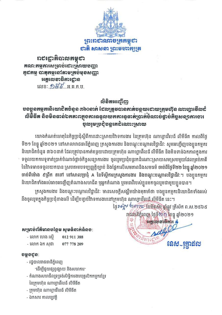 ក្រសួងការងារ ចេញលិខិតអញ្ជើញបងប្អូនកម្មករនិយោជិតចំនួន ៣៦០នាក់ ដែលត្រូវបានកាត់បន្ថយដោយក្រុមហ៊ុន ណាហ្គាវើលដ៍ និងមិនទាន់ឯកភាពក្នុងការទទួលយកការទូទាត់ប្រាក់បំណាច់ផ្ដាច់កិច្ចសន្យាការងារចូលរួមប្រជុំបន្តរកដំណោះស្រាយ