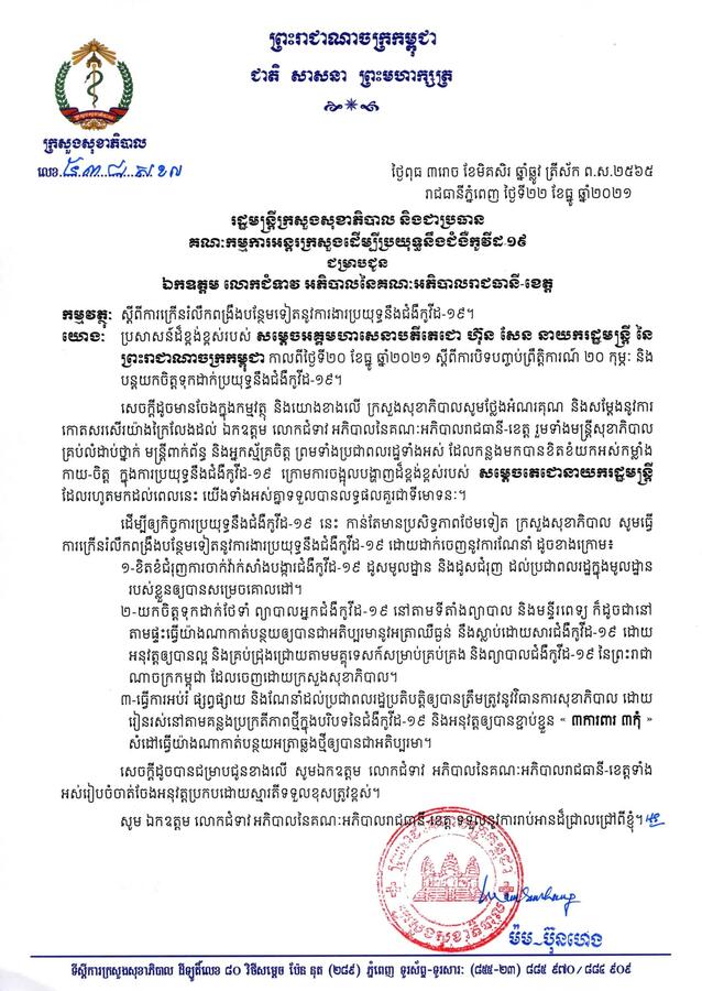 រាជធានីភ្នំពេញ៖ យោងតាមការចុះផ្សាយរបស់ ក្រសួងព័ត៌មាន បានឲ្យដឹងថា នៅថ្ងៃទី២២ ខែធ្នូ ឆ្នាំ២០២១នេះ ឯកឧត្តមសាស្ត្រាចារ្យ ម៉ម ប៊ុន ហេង រដ្ឋមន្ត្រីក្រសួងសុខាភិបាលបានផ្ញើលិខិតជូនអភិបាលរាជធានី-ខេត្តទាំងអស់ ដើម្បីការក្រើនរំលឹកពង្រឹងបន្ថែមទៀត នូវការងារប្រយុទ្ធនឹងជំងឺកូវីដ-១៩។