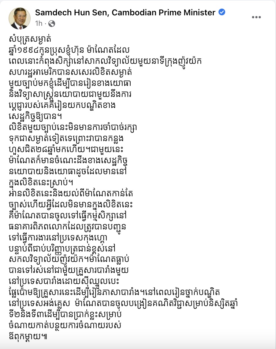 សម្តេចតេជោ ហ៊ុន សែន បានបង្ហោះសារទាំងស្រុងអមដោយខ្លឹមសារសំបុត្រសម្ងាត់យ៉ាងដូច្នេះថា «សំបុត្រសម្ងាត់ ឆ្នាំ១៩៩៤ កូនប្រុសខ្ញុំ ហ៊ុន ម៉ាណែត ដែលពេលនោះកំពុងសិក្សា នៅសកលវិទ្យាល័យមួយនាទីក្រុងញូវយ៉ក សហរដ្ឋអាមេរិក បានសរសេរលិខិតសម្ងាត់មួយច្បាប់មកខ្ញុំ ដើម្បីបានរៀនខាងយោធា និងវិទ្យាសាស្រ្តនយោបាយជាមួយនិងការប្តេជ្ញារបស់គេ គឺរៀនយកបណ្ឌិតខាងសេដ្ឋកិច្ចឲ្យបាន។