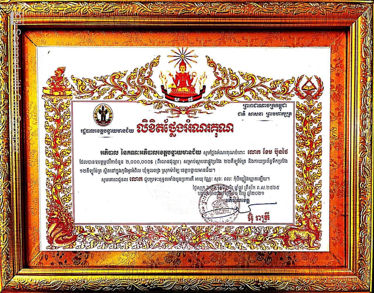 តារាចម្រៀងល្បីឈ្មោះរូបនេះបានរៀបរាប់នៅលើ Facebook លោកថា៖ “ការជួយដល់សង្គមជាតិ និង ប្រជាជន យើងគឺជាតួនាទីរបស់យើងទាំងអស់គ្នា។ ថវិការ 2,000,000$ (ពីរលានដុល្លា) ជាថវិការដ៏ច្រើនសំរាប់ខ្ញុំតែខ្ញុំរីករាយនឹងរួមចំណែកជាមួយរាជរដ្ឋាភិបាលដើម្បីកសាងនៅផ្លូវ និង ប្រឡាយទឹកជួយសម្រួល ដល់ពុកម៉ែបងប្អូនដែលរស់នៅស្រុក ម៉ាឡៃ ខេត្តបន្ទាយមានជ័យ និង ទូទាំងប្រទេសតាមអ្វីដែរខ្ញុំអាចធ្វើបាន”