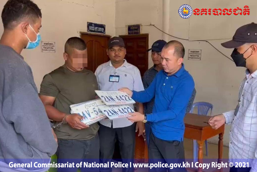 ត្រូវបានសមត្ថកិច្ចនៃអធិការដ្ឋាននគរបាលខណ្ឌពោធិ៍សែនជ័យ សហការជាមួយកម្លាំងជំនាញនៃស្នងការដ្ឋាននគរបាលរាជធានីភ្នំពេញ ស្រាវជ្រាវ ឃាត់ខ្លួនបាន រួមជាមួយនឹងស្លាកលេខរថយន្តជាច្រើនសន្លឹក នៅព្រឹកថ្ងៃទី២៤ ខែធ្នូ ឆ្នាំ២០២១ ដោយលោកវរសេនីយ៍ឯក ម៉ន វុធី អធិការនៃអធិការដ្ឋាននគរបាលខណ្ឌពោធិ៍សែនជ័យ សហការជាមួយកម្លាំងនគរបាលព្រហ្មទណ្ឌកំរិតស្រាលនៃស្នងការនគរបាលរាជធានីភ្នំពេញ ចុះឆែកមើលកាំមេរ៉ាសុវត្ថិភាព ដើម្បីស្វែងរកជនល្មើស ៕