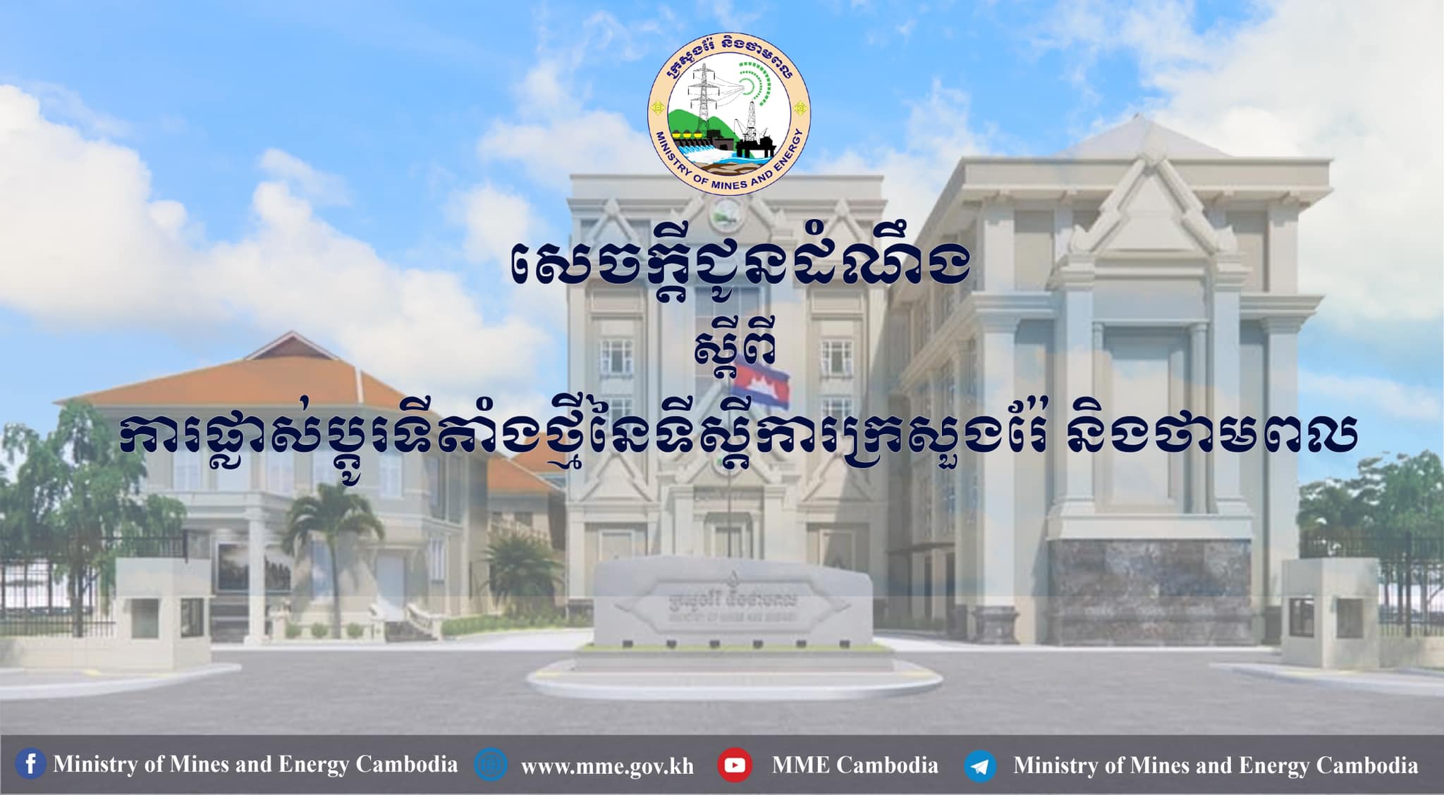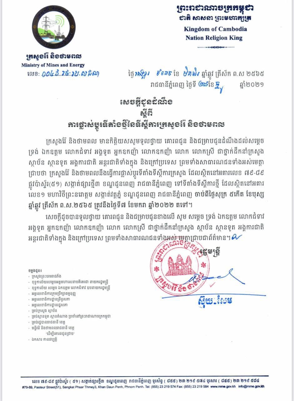 ក្រសួងរ៉ែ និងថាមពល ជូនដំណឹងពីការផ្លាស់ប្តូរទីតាំងថ្មីនៃទីស្ដីការក្រសួងរ៉ែ និងថាមពល ចាប់ពីថ្ងៃទី០៧ ខែមករា ឆ្នាំ២០២២នេះតទៅ