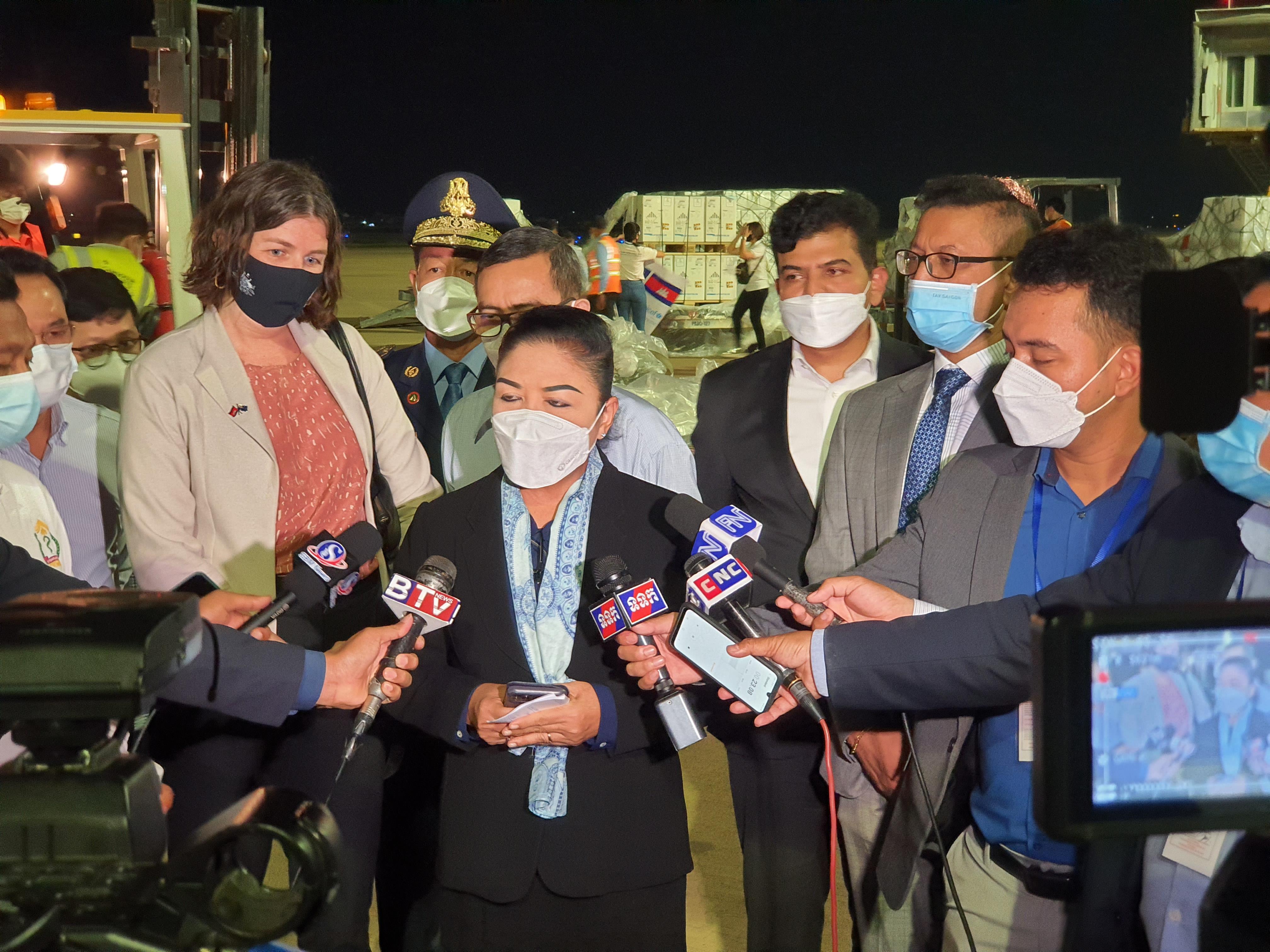 រាជធានីភ្នំពេញ៖ យោងតាមការចុះផ្សាយរបស់ ក្រសួងព័ត៌មាន បានឲ្យដឹងថា កាលពីយប់ថ្ងៃទី២៨ ខែធ្នូ ឆ្នាំ២០២១ លោកជំទាវ យក់ សម្បត្តិ រដ្ឋលេខាធិការក្រសួងសុខាភិបាល បានអញ្ជើញផ្តល់បទសម្ភាសន៍ដល់អ្នកសារព័ត៌មាន ខណ:លោកជំទាវ និងតំណាងស្ថានទូតអូស្ត្រាលី ប្រចាំកម្ពុជា អញ្ជើញទទួលការមកដល់នូវវ៉ាក់សាំងប្រភេទ Pfizer បង្ការជំងឺកូវីដ១៩ ចំនួន ១ ៥៦៧ ៥៣០ ដូសបន្ថែមទៀត ដែលជាជំនួយរបស់រដ្ឋាភិបាល និងប្រជាពលរដ្ឋអូស្ត្រាលី ជើងទី២ ផ្តល់ជូនរាជរដ្ឋាភិបាល និងប្រជាជនកម្ពុជា នៅអាកាសយានដ្ឋានអន្តរជាតិភ្នំពេញ។