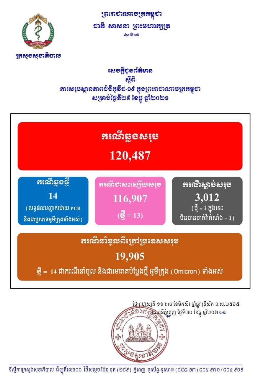 នៅថ្ងៃទី30 ខែធ្នូ ឆ្នាំ2021នេះ ក្រសួងសុខាភិបាលកម្ពុជា បានចេញសេចក្តីជូនដំណឹងពី ការរកឃើញករណីវិជ្ជមានវីរុសកូវីដ១៩ថ្មី ចំនួន 14នាក់ (លទ្ធផលបញ្ជាក់ដោយ PCR នឹងជាប្រភេទអូមីក្រុងទាំងអស់) ខណៈអ្នកបានជាសះស្បើយថ្មីមានចំនួន 13នាក់ និងមានអ្នកបាត់បង់ជីវិតថ្មី 1នាក់(មិនបានចាក់វ៉ាក់សាំង 1នាក់) គិតមកទល់ពេលនេះ ករណីឆ្លងកូវីដ១៩ សរុបនៅក្នុងប្រទេសកម្ពុជា មានចំនួន 120,487នាក់, ករណីជាសះស្បើយសរុប 116,907នាក់ និងស្លាប់សរុប 3,012នាក់៕