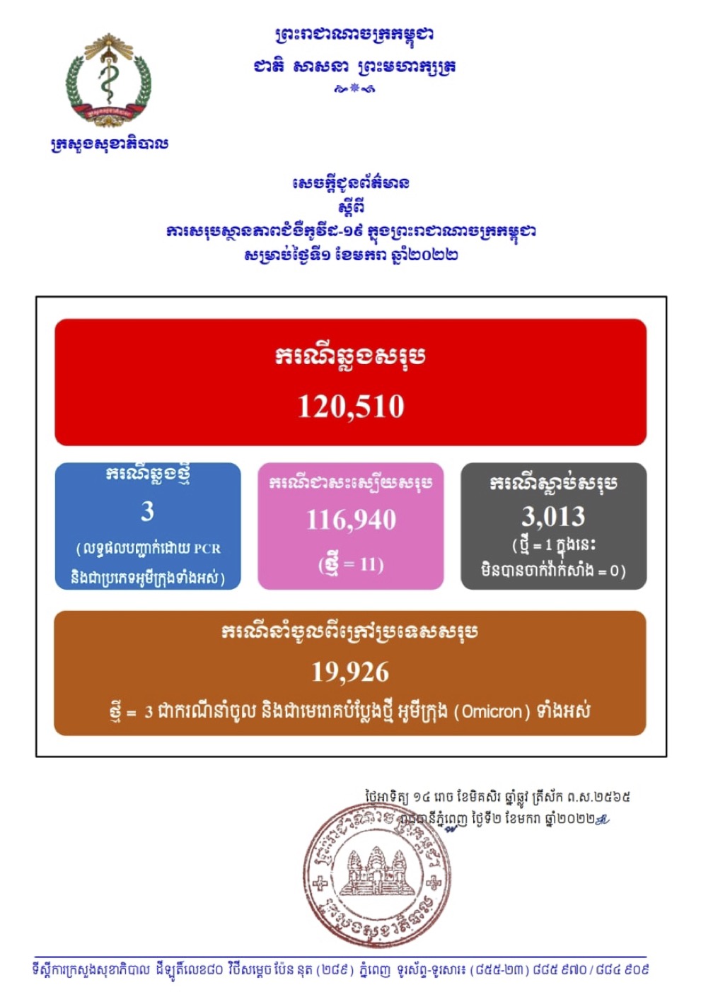 នៅថ្ងៃទី2 ខែមករា ឆ្នាំ2022នេះ ក្រសួងសុខាភិបាលកម្ពុជា បានចេញសេចក្តីជូនដំណឹងពី ការរកឃើញករណីវិជ្ជមានវីរុសកូវីដ១៩ថ្មី ចំនួន 03នាក់ (លទ្ធផលបញ្ជាក់ដោយ PCR នឹងជាប្រភេទអូមីក្រុងទាំងអស់) ខណៈអ្នកបានជាសះស្បើយថ្មីមានចំនួន 11នាក់ និងអ្នកបាត់បង់ជីវិតថ្មីចំនួន ១នាក់ (មិនបានចាក់វ៉ាក់សាំង ០នាក់) គិតមកទល់ពេលនេះ ករណីឆ្លងកូវីដ១៩ សរុបនៅក្នុងប្រទេសកម្ពុជា មានចំនួន 120,510នាក់, ករណីជាសះស្បើយសរុប 116,940នាក់ និងស្លាប់សរុប 3,013នាក់៕