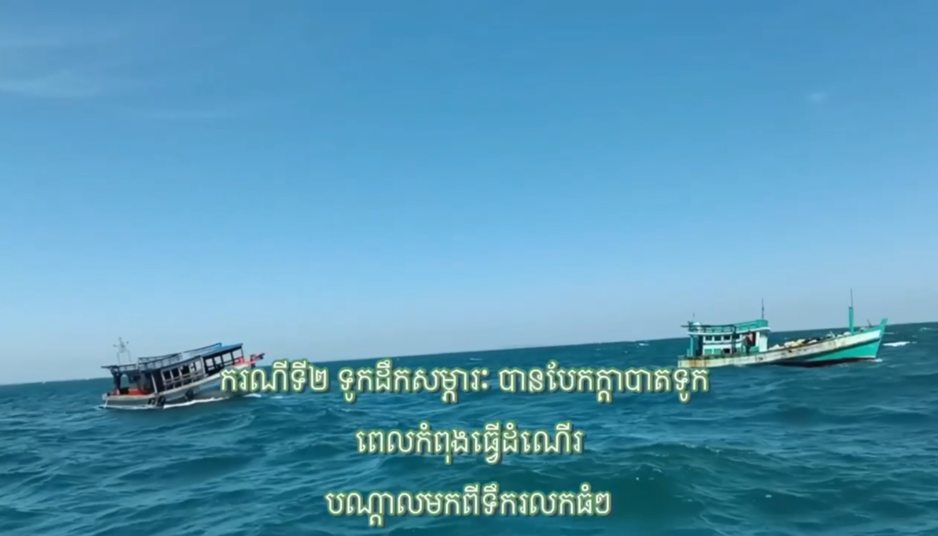 -ករណីទី២ ទូកដឹកសម្ភារៈ មួយគ្រឿង កំពុងធ្វើដំណើរនៅផ្ទៃសមុទ្រ មានមនុស្សរួមដំណើរក្នុងទូកចំនួន ១០នាក់ ក្នុងនោះមានក្មេងចំនួន ៣នាក់ (ស្រីចំនួន២នាក់ ) ពេលមកដល់ចំណុចខាងជើងកោះដែកគោល ទូកក៏បានបែកក្តាបាត បណ្តាលមកពីទឹករលកធំៗ ៕