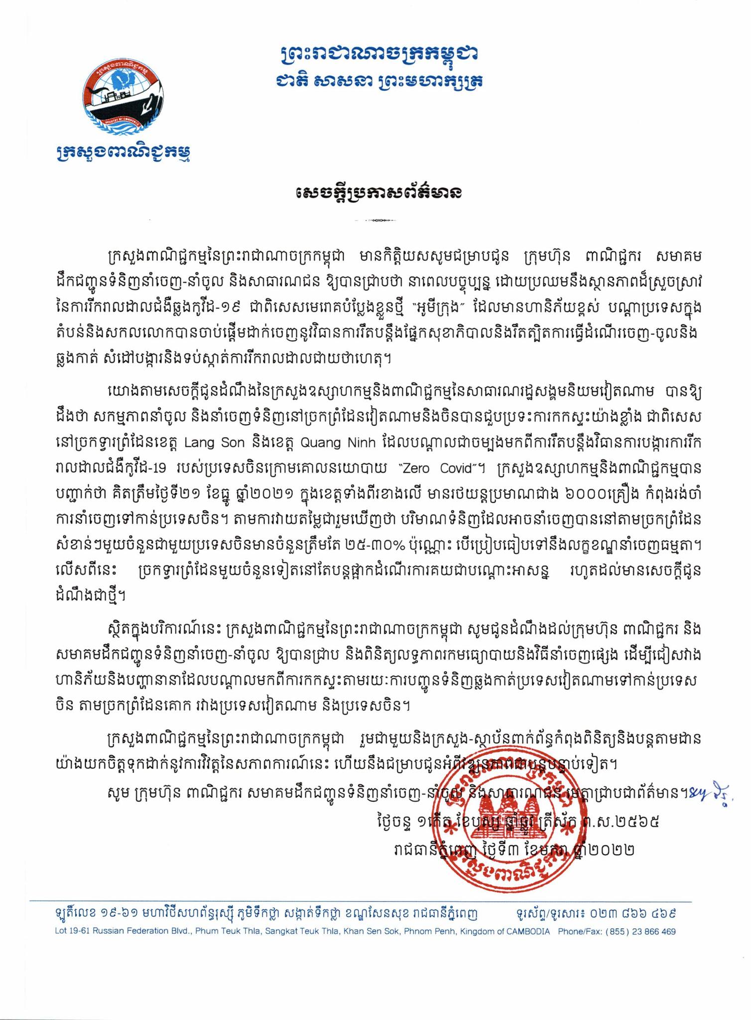 រាជធានីភ្នំពេញ៖ យោងតាមការចុះផ្សាយរបស់ ក្រសួងព័ត៌មាន នៅថ្ងៃទី០៤ ខែមករា ឆ្នាំ២០២២ បានឲ្យដឹងថា ក្រសួងពាណិជ្ជកម្ម បានចេញសេចក្ដីប្រកាសព័ត៌មាន សូមជម្រាបជូន ក្រុមហ៊ុន ពាណិជ្ជករ សមាគម ដឹកជញ្ជូនទំនិញចេញ-នាំចូល និងសាធារណជន ឲ្យបានជ្រាបថា នាពេលបច្ចុប្បន្ន ដោយប្រឈមនឹងស្ថានភាពដ៏ស្រួចស្រាវនៃការរីករាលដាលជំងឺឆ្លងកូវីដ-១៩ ជាពិសេសមេរោគបំប្លែងខ្លួនថ្មី “អូមីក្រុង” ដែលមានហានិភ័យខ្ពស់ បណ្ដាប្រទេសក្នុងតំបន់និងសកលលោកបានចាប់ផ្ដើមដាក់នូវវិធានការរឹតបន្តឹងផ្នែកសុខាភិបាល និងរឹតត្បិតការធ្វើដំណើរចេញ-ចូលនិងឆ្លងកាត់ សំដៅបង្ការ និងទប់ស្កាត់ការីករាលដាលជាយថាហេតុ។