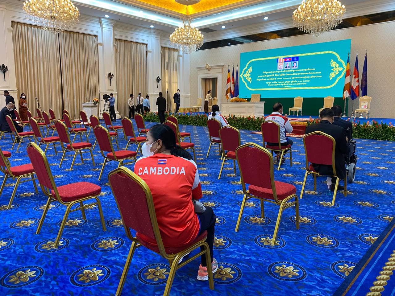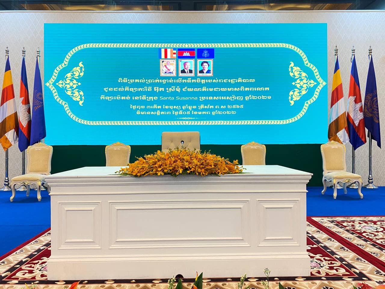 រាជធានីភ្នំពេញ៖ នៅថ្ងៃទី០៥ ខែមករា ឆ្នាំ២០២២ សម្តេចតេជោ ហ៊ុន សែន នាយករដ្ឋមន្ត្រីនៃព្រះរាជាណាចក្រកម្ពុជា បានអញ្ជើញជាអធិបតីភាពក្នុងពិធីប្រគល់ប្រាក់រង្វាន់ជូនកីឡាការិនី អ៊ុក ស្រីមុំ បន្ទាប់ពីដណ្តើមបានមេដាយមាសពិភពលោកពីការប្រកួតប៉េតង់នៅទីក្រុងសាន់តាស៊ូសាណា ប្រទេសអេស្ប៉ាញ កាលពីខែវិច្ឆិកា ឆ្នាំ២០២១។