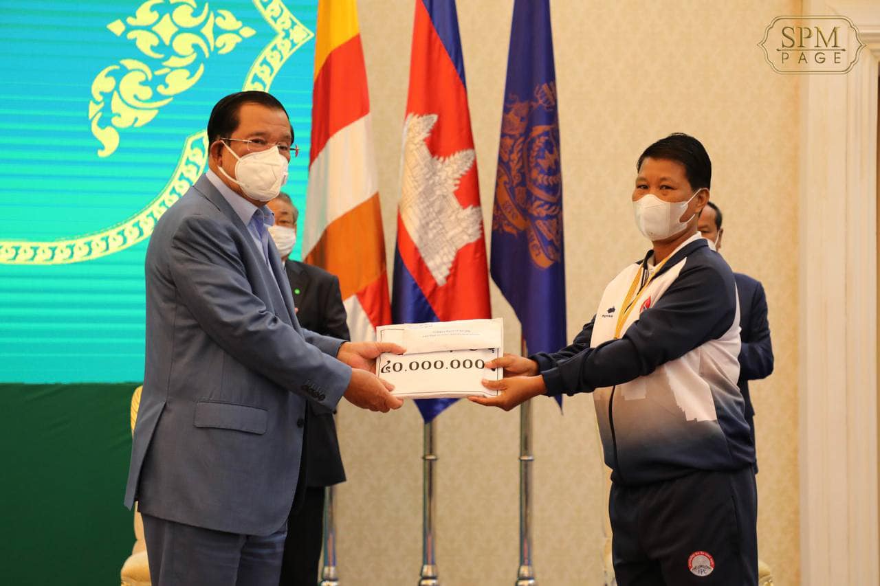 នៅព្រឹកថ្ងៃពុធ ៣កើត ខែបុស្ស ឆ្នាំឆ្លូវ ត្រីស័ក ព.ស. ២៥៦៥ ត្រូវនឹង ថ្ងៃទី៥ ខែមករា ឆ្នាំ២០២២នេះ សម្តេចអគ្គមហាសេនាបតីតេជោ ហ៊ុន សែន នាយករដ្ឋមន្ត្រីនៃព្រះរាជាណាចក្រកម្ពុជា បានអញ្ជើញជាអធិបតីភាពដ៏ខ្ពង់ខ្ពស់ក្នុងពិធីប្រគល់ប្រាក់រង្វាន់ជូនកីឡាការិនី អ៊ុក ស្រីមុំ បន្ទាប់ពីដណ្តើមបានមេដាយមាសពិភពលោកពីការប្រកួតប៉េតង់នៅទីក្រុងសាន់តាស៊ូសាណា ប្រទេសអេស្ប៉ាញ កាលពីខែវិច្ឆិកា ឆ្នាំ២០២១។