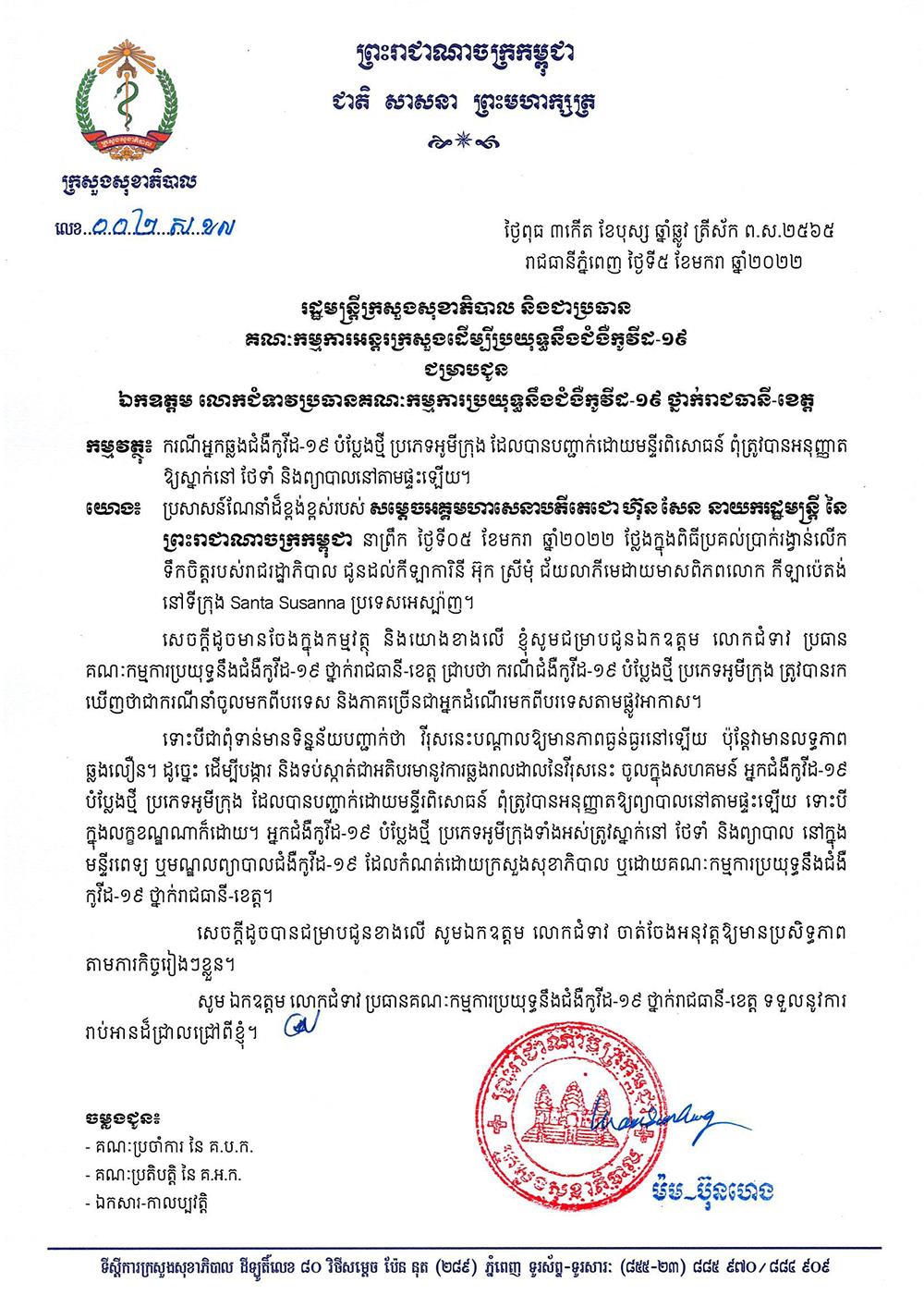 ក្រសួងសុខាភិបាល ចេញសេចក្ដីប្រកាសសម្រាប់អ្នកឆ្លងជំងឺកូវីដ-១៩ បំប្លែងថ្មី ប្រភេទអូមីក្រុង មិនអនុញ្ញាតឲ្យមានការព្យាបាលនៅតាមផ្ទះជាដាច់ខាត