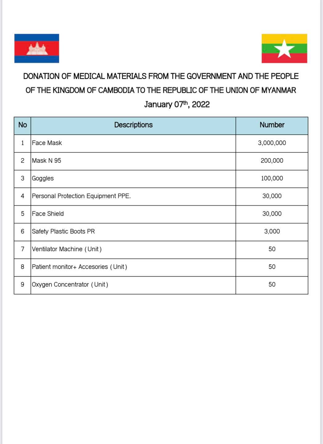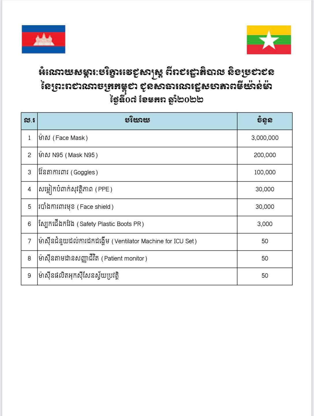 ថ្ងៃស្អែកកម្ពុជានឹងនាំយកអំណោយម៉ាសចំនួន ៣,២លាន និងសម្ភារៈវេជ្ជសាស្ត្រមួយចំនួនទៀត ជូនមីយ៉ាន់ម៉ា ក្នុងដំណើរទស្សកិច្ចរបស់សម្តេចតេជោ ហ៊ុន សែន