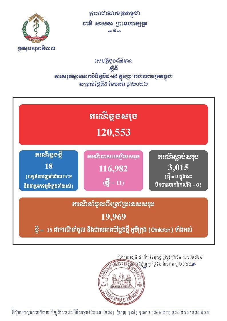 នៅថ្ងៃទី06 ខែមករា ឆ្នាំ2022នេះ ក្រសួងសុខាភិបាលកម្ពុជា បានចេញសេចក្តីជូនដំណឹងពី ការរកឃើញករណីវិជ្ជមានវីរុសកូវីដ១៩ថ្មី ចំនួន 18នាក់ (លទ្ធផលបញ្ជាក់ដោយ PCR នឹងជាប្រភេទអូមីក្រុងទាំងអស់) ខណៈអ្នកបានជាសះស្បើយថ្មីមានចំនួន 11នាក់ និងអ្នកបាត់បង់ជីវិតថ្មីចំនួន 0នាក់ (មិនបានចាក់វ៉ាក់សាំង ០នាក់) គិតមកទល់ពេលនេះ ករណីឆ្លងកូវីដ១៩ សរុបនៅក្នុងប្រទេសកម្ពុជា មានចំនួន 120,553នាក់, ករណីជាសះស្បើយសរុប 116,982នាក់ និងស្លាប់សរុប 3,015នាក់៕