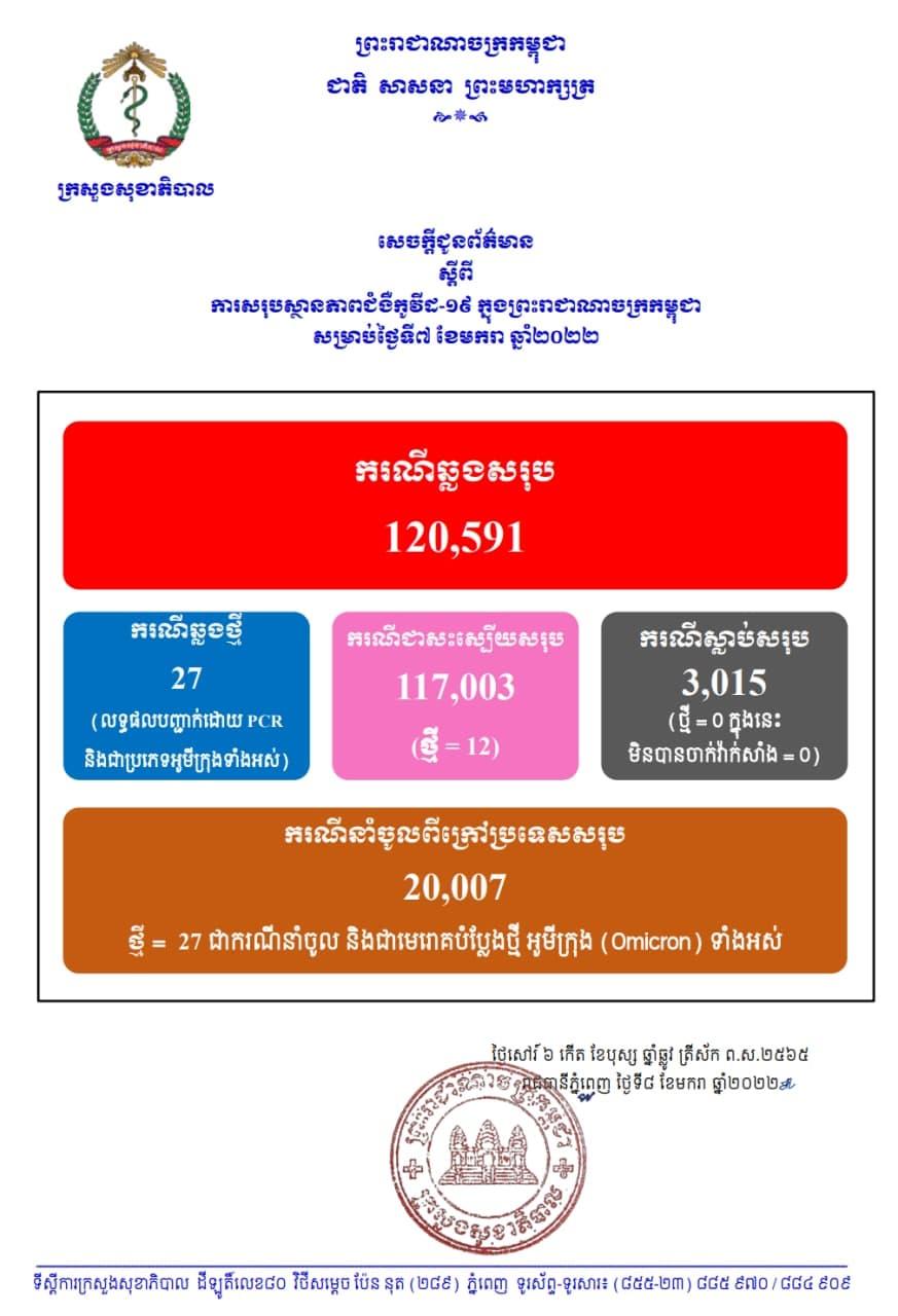 នៅថ្ងៃទី08 ខែមករា ឆ្នាំ2022នេះ ក្រសួងសុខាភិបាលកម្ពុជា បានចេញសេចក្តីជូនដំណឹងពី ការរកឃើញករណីវិជ្ជមានវីរុសកូវីដ១៩ថ្មី ចំនួន 27នាក់ (លទ្ធផលបញ្ជាក់ដោយ PCR នឹងជាប្រភេទអូមីក្រុងទាំងអស់) ខណៈអ្នកបានជាសះស្បើយថ្មីមានចំនួន 12នាក់ និងមិនមានអ្នកបាត់បង់ជីវិតថ្មីនោះទេគិតមកទល់ពេលនេះ ករណីឆ្លងកូវីដ១៩ សរុបនៅក្នុងប្រទេសកម្ពុជា មានចំនួន 120,591នាក់, ករណីជាសះស្បើយសរុប 117,003នាក់ និងស្លាប់សរុប 3,015នាក់៕​