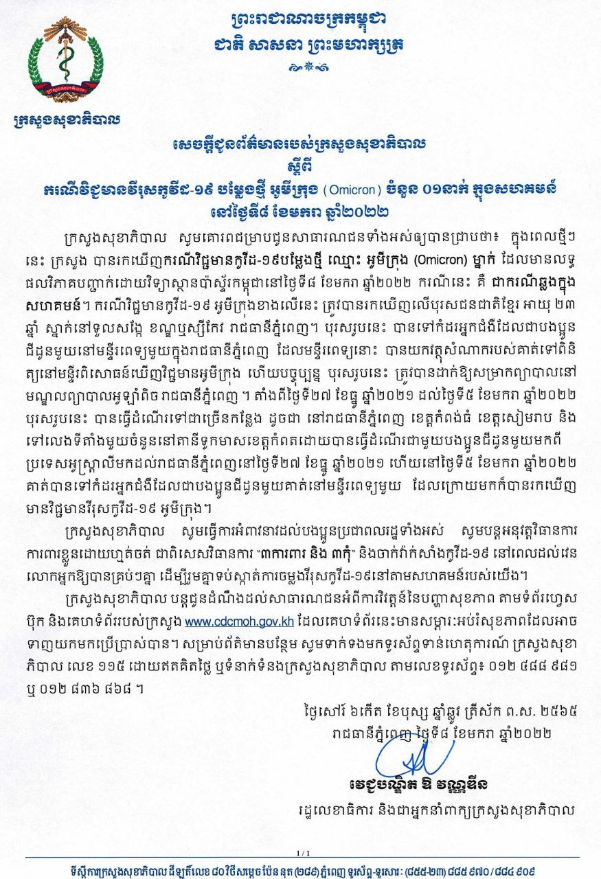 កាលពីយប់ថ្ងៃទី០៨ ខែមករា ឆ្នាំ២០២២ ក្រសួងសុខាភិបាលបានធ្វើការប្រកាសរកឃើញករណីវិជ្ជមានកូវីដ-១៩ បម្លែងថ្មីឈ្មោះ អូមីក្រុង ម្នាក់ដែលមានលទ្ធផលវិភាគបញ្ជាក់ដោយវិទ្យាស្ថានប៉ាស្ទ័រកម្ពុជានៅថ្ងៃទី៨ ខែមករា ឆ្នាំ២០២២ ហើយករណីនេះ គឺជាករណីឆ្លងក្នុងសហគមន៍។ ករណីវិជ្ជមានកូវីដ-១៩ អូមីក្រុងនេះ ត្រូវបានរកឃើញលើបុរសជនជាតិខ្មែរ អាយុ២៣ឆ្នាំ ស្នាក់នៅទួលសង្កែ ខណ្ឌឬស្សីកែវ រាជធានីភ្នំពេញ។ សូមអានលិខិតលំអិតខាងក្រោម៖