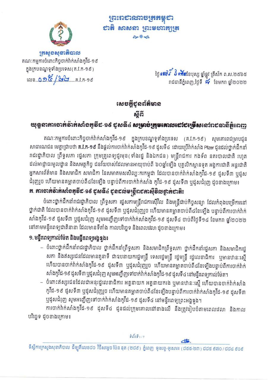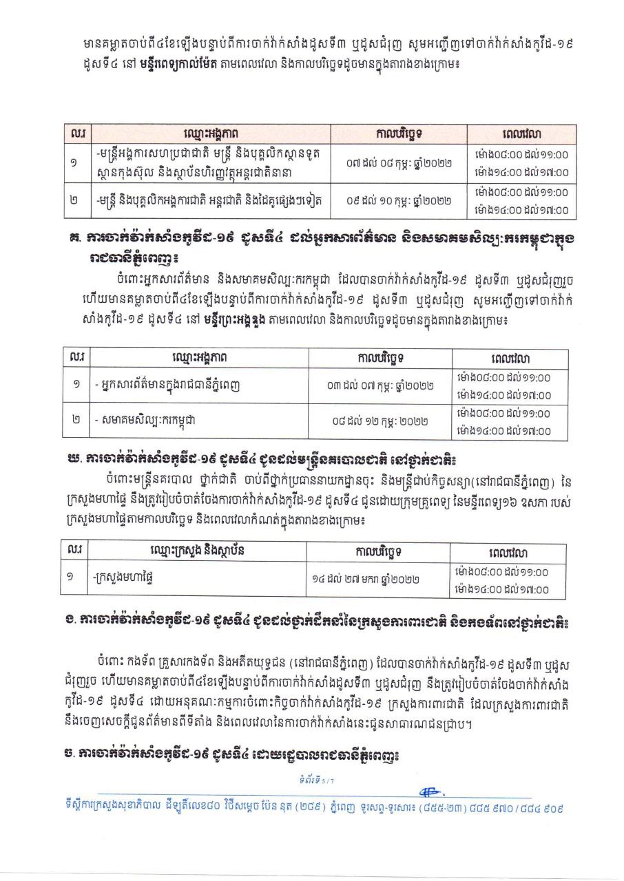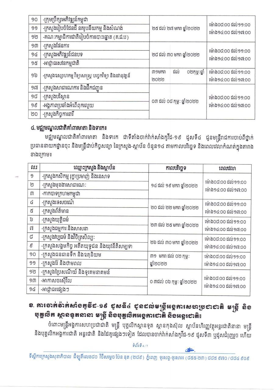 ចំពោះថ្នាក់ដឹកនាំ រាជរដ្ឋាភិបាល ព្រឹទ្ធសភា រដ្ឋសភា មន្ត្រីរាជការស៊ីវិល និងមន្ត្រីជាប់កិច្ចសន្យា ដែលកំពុងបម្រើការនៅថ្នាក់ជាតិ ដែលបានចាក់វ៉ាក់សាំងកូវីដ-១៩ ដូសទី៣ ឬដូសជំរុញរួច ហើយមានគម្លាតចាប់ពី៤ខែឡើង បន្ទាប់ពីការចាក់វ៉ាក់សាំងកូវីដ-១៩ ដូសទី៣ ឬដូសជំរុញ សូមអញ្ជើញទៅចាក់វ៉ាក់សាំងកូវីដ-១៩ ដូសទី៤ ចាប់ពីថ្ងៃទី១៤ ខែមករា ឆ្នាំ២០២២ នៅតាមមន្ទីរពេទ្យជាតិនានា ដែលមានទីតាំង កាលបរិច្ឆេទ និងពេលវេលាដូចខាងក្រោម៖