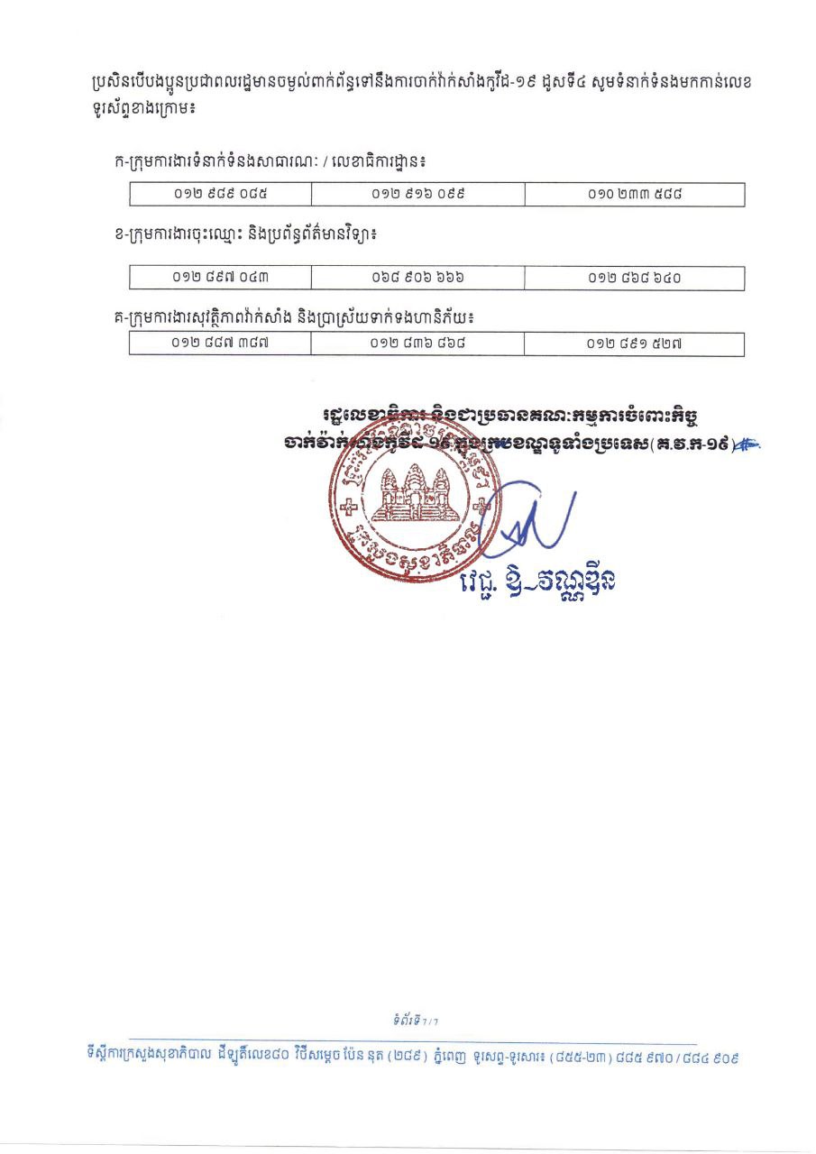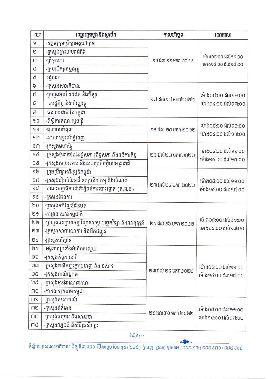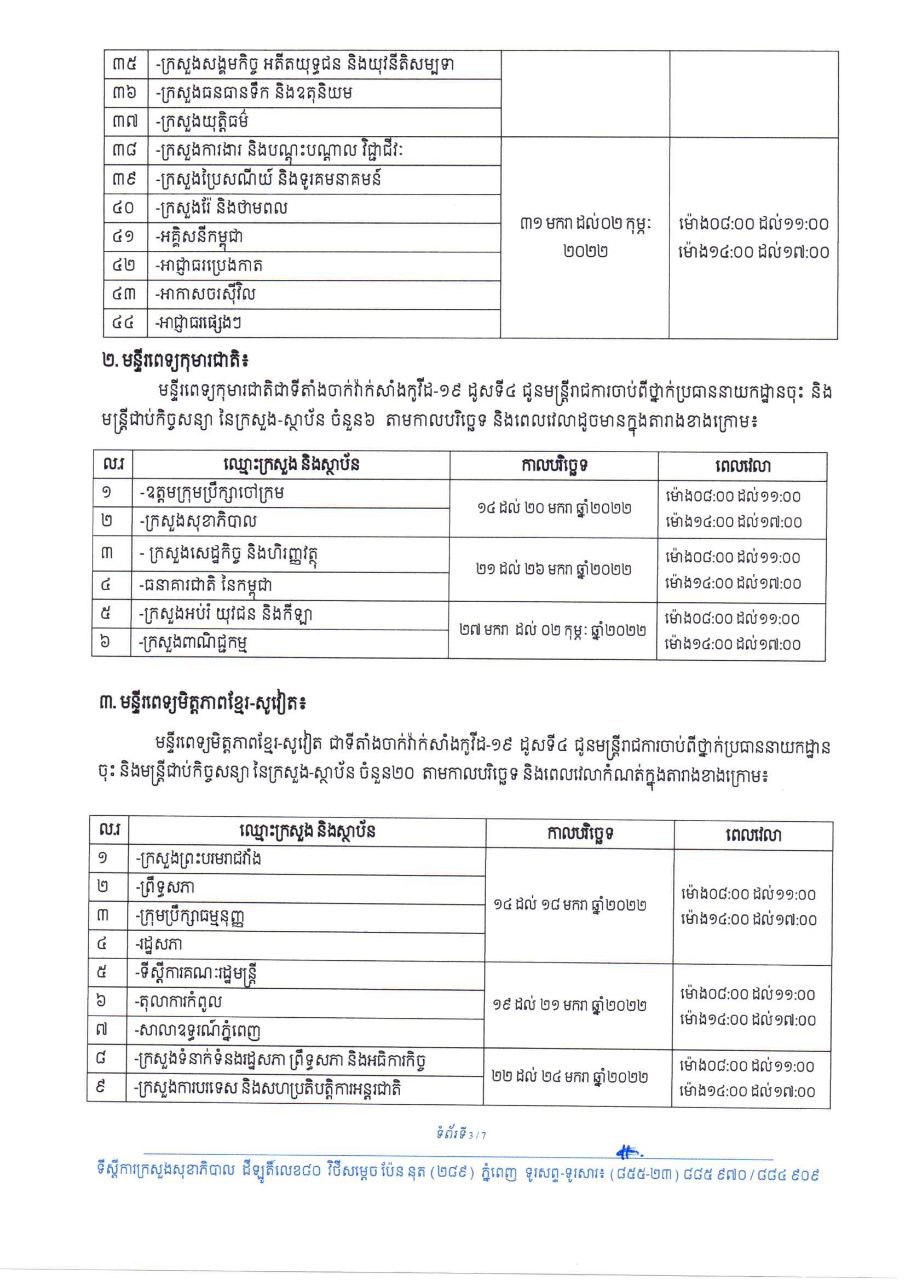 ចំពោះថ្នាក់ដឹកនាំ រាជរដ្ឋាភិបាល ព្រឹទ្ធសភា រដ្ឋសភា មន្ត្រីរាជការស៊ីវិល និងមន្ត្រីជាប់កិច្ចសន្យា ដែលកំពុងបម្រើការនៅថ្នាក់ជាតិ ដែលបានចាក់វ៉ាក់សាំងកូវីដ-១៩ ដូសទី៣ ឬដូសជំរុញរួច ហើយមានគម្លាតចាប់ពី៤ខែឡើង បន្ទាប់ពីការចាក់វ៉ាក់សាំងកូវីដ-១៩ ដូសទី៣ ឬដូសជំរុញ សូមអញ្ជើញទៅចាក់វ៉ាក់សាំងកូវីដ-១៩ ដូសទី៤ ចាប់ពីថ្ងៃទី១៤ ខែមករា ឆ្នាំ២០២២ នៅតាមមន្ទីរពេទ្យជាតិនានា ដែលមានទីតាំង កាលបរិច្ឆេទ និងពេលវេលាដូចខាងក្រោម៖