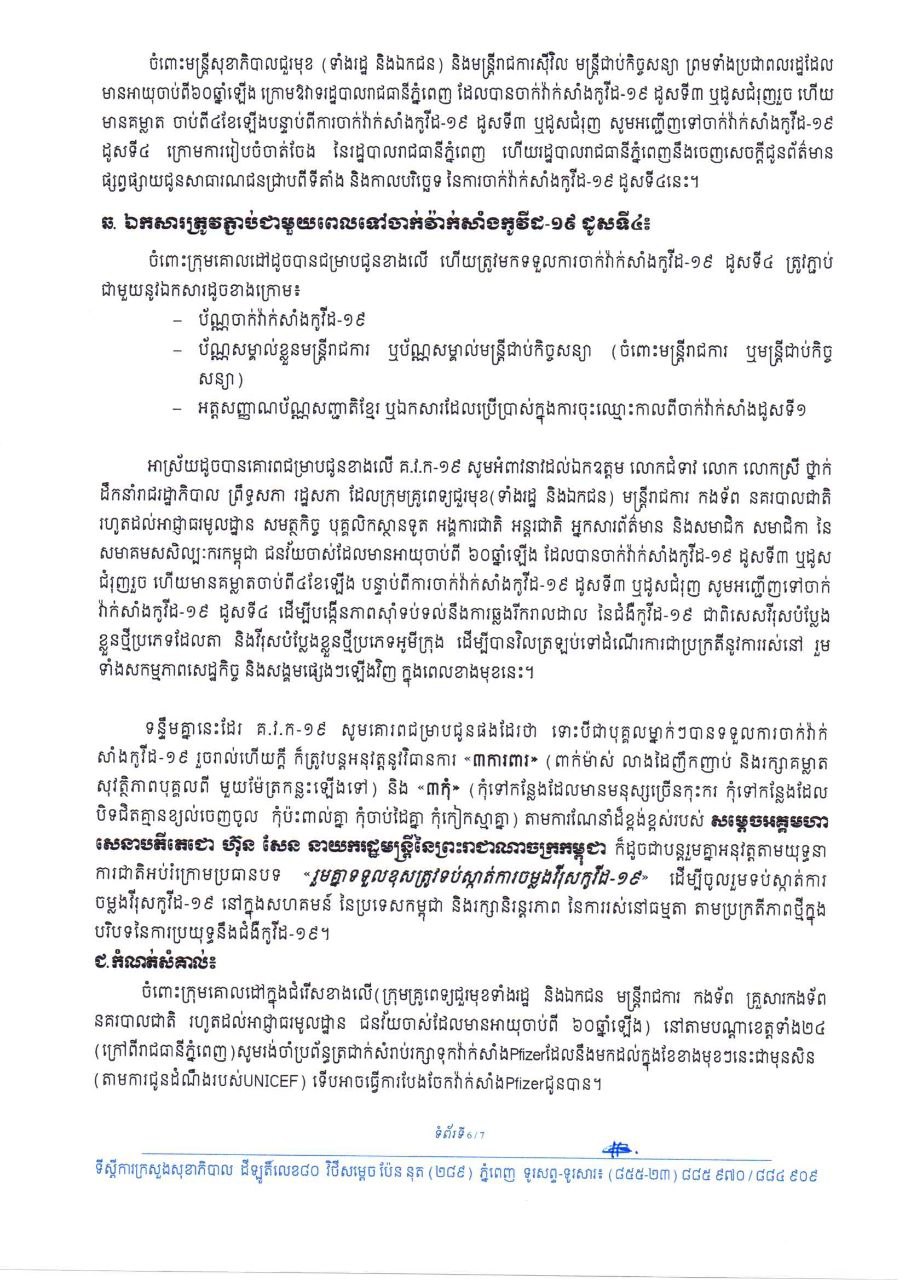យោងតាមគណៈកម្មការចំពោះកិច្ចចាក់វ៉ាក់សាំងកូវីដ-១៩ ក្នុងក្របខណ្ឌទូទាំងប្រទេស បានឲ្យដឹងថា គ.វ.ក-១៩ នឹងផ្តល់ការចាក់វ៉ាក់សាំងកូវីដ-១៩ ដូសទី៤ ដោយប្រើវ៉ាក់សាំង Pfizer ជូនដល់ថ្នាក់ដឹកនាំ រាជរដ្ឋាភិបាល ព្រឹទ្ធសភា រដ្ឋសភា ក្រុមគ្រូពេទ្យជួរមុខ (ទាំងរដ្ឋ និងឯកជន) មន្ត្រីរាជការ កងទ័ព នគរបាលជាតិ រហូតដល់អាជ្ញាធរមូលដ្ឋាន និងសមត្ថកិច្ច ជនវ័យចាស់ដែលមានអាយុចាប់ពី ៦០ឆ្នាំឡើង បុគ្គលិកស្ថានទូត អង្គការជាតិ អន្តរជាតិ អ្នកសារព័ត៌មាន និងសមាជិក សមាជិកា នៃសមាគមសិល្បៈករកម្ពុជា ដែលបានចាក់វ៉ាក់សាំងកូវីដ-១៩ ដូសទី៣ ឬដូសជំរុញរួច ហើយមានគម្លាតចាប់ពី៤ខែឡើង បន្ទាប់ពីការចាក់វ៉ាក់សាំង កូវីដ-១៩ ដូសទី៣ ឬដូសជំរុញ។