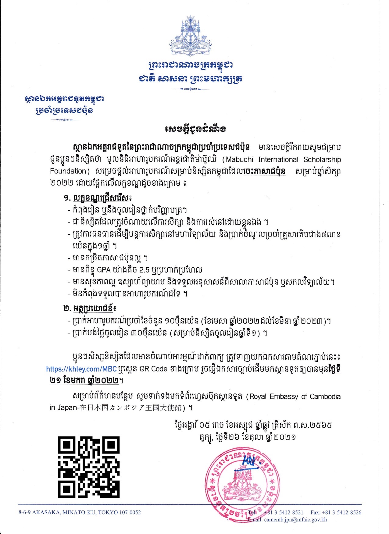 រាជធានីភ្នំពេញ៖ យោងតាមការចុះផ្សាយរបស់ ស្ថានឯកអគ្គរាជទូតកម្ពុជា ប្រចាំប្រទេសជប៉ុន នៅថ្ងៃទី១១ ខែមករា ឆ្នាំ២០២២ បានចេញសេចក្ដីជូនដំណឹង ជម្រាបជូនប្អូនៗនិស្សិតថា មូលនិធិអាហាររូបករណ៍អន្តរជាតិម៉ាប៊ូឈិ (Mabuchi International Scholarship Foundation) សម្រេចផ្ដល់អាហារូបករណ៍សម្រាប់និស្សិតកម្ពុជាដែលចេះភាសាជប៉ុន សម្រាប់ឆ្នាំសិក្សា២០២២ ដោយផ្អែកលើលក្ខខណ្ឌដូចខាងក្រោម៖
