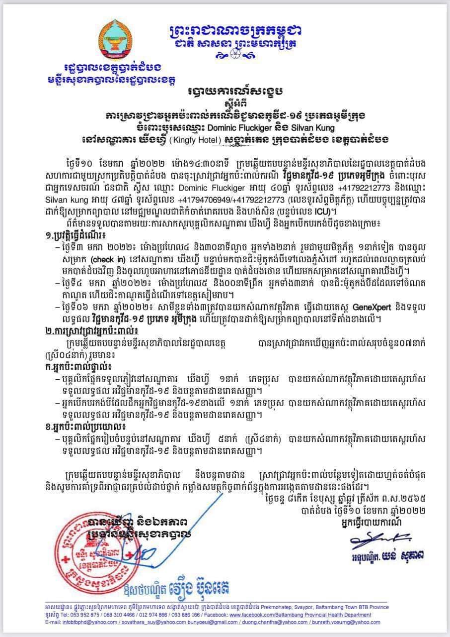 ថ្ងៃទី១០ ខែមករា ឆ្នាំ២០២២ ម៉ោង១៤៖៣០នាទី ក្រុមឆ្លើយតបបន្ទាន់មន្ទីរសុខាភិបាលនៃរដ្ឋបាលខេត្តបាត់ដំបង សហការជាមួយស្រុកប្រតិបត្តិបាត់ដំបង បានចុះស្រាវជ្រាវអ្នកប៉ះពាល់ករណី វិជ្ជមានកូវីដ-១៩ ប្រភេទអូមីក្រុង ចំពោះបុរសអ្នកទេសចរណ៍ ជនជាតិ ស្វីស ឈ្មោះ Dominic Fluckiger អាយុ ៤០ឆ្នាំ ទូរស័ព្ទលេខ +៤១៧៩២២១២៧៧៣ និងឈ្មោះ Silvan Kung អាយុ ៤៧ ហើយបច្ចុប្បន្នត្រូវបានដាក់ឲ្យសម្រាកព្យាបាល នៅមជ្ឍមណ្ឌលជាតិកំចាត់រោគរបង និងហង់សិន (បន្ទប់លេខICU).