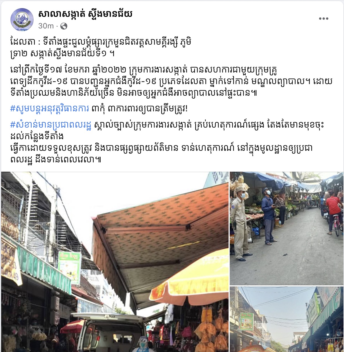សាលាសង្កាត់ ស្ទឹងមានជ័យ បញ្ជាក់ថា រកឃើញករណីវិជ្ជមានកូវីដ-១៩ ប្រភេទ ដែលតា នៅម្តុំផ្សារក្រមួនជិតវត្តសាមគ្គីរង្សី
