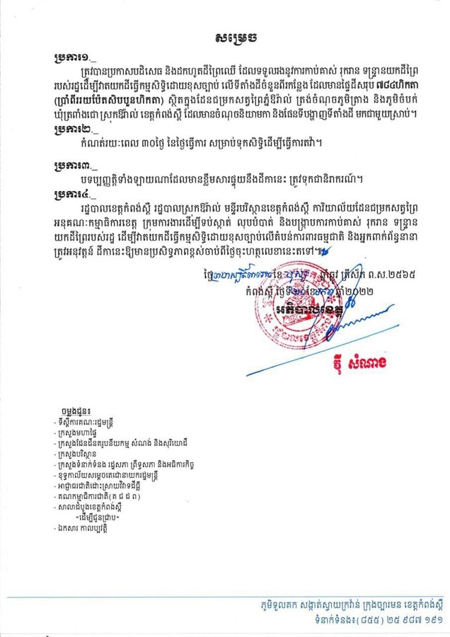រដ្ឋបាលខេត្តកំពង់ស្ពឺចេញដីកាប្រកាសបដិសេធនិងដកហូតដីព្រៃឈើចំនួន ៧៨៤ ហិកតា ស្ថិតក្នុង ដែនជម្រកសត្វព្រៃឱរ៉ាល់