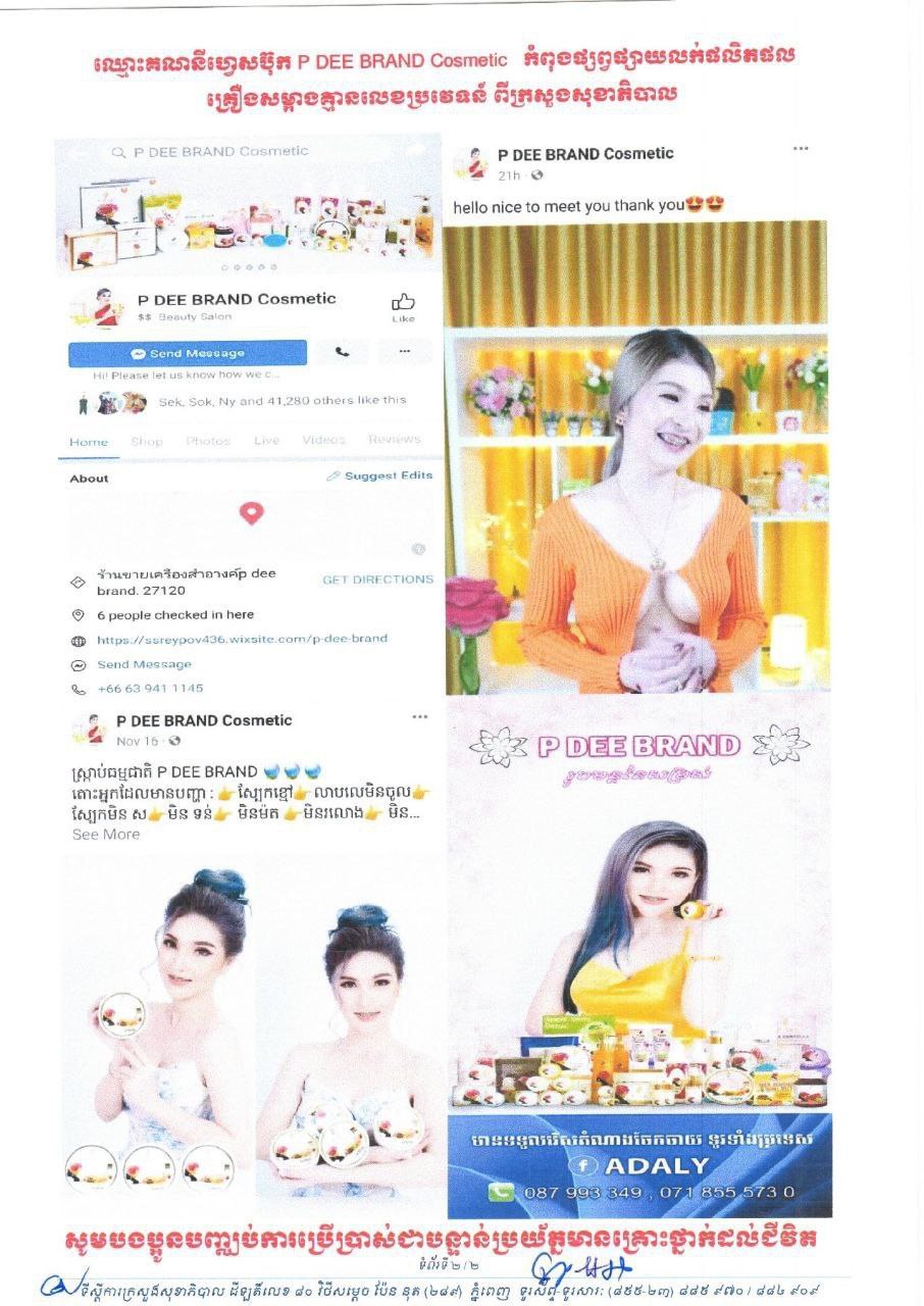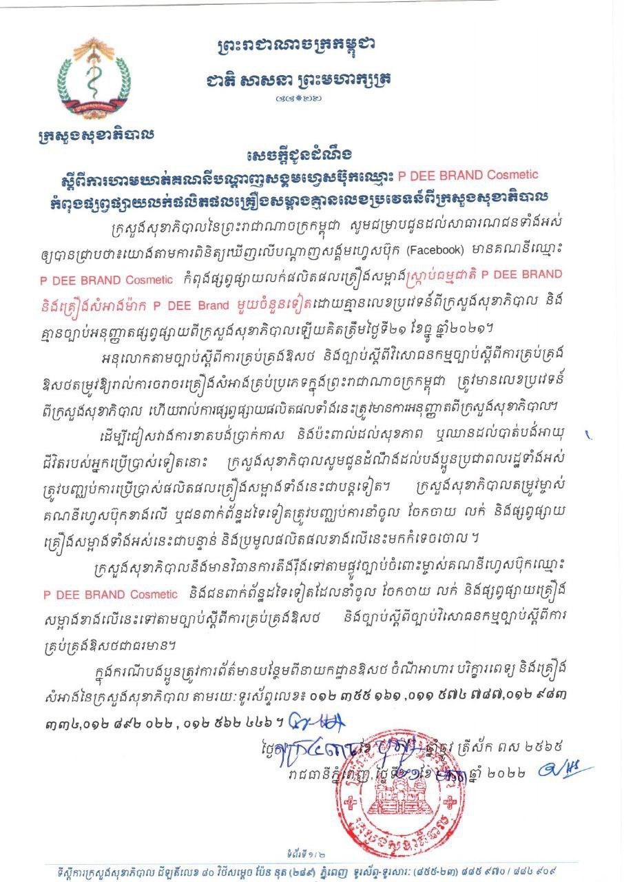 យោងតាមការបញ្ជាក់របស់ ក្រសួងសុខាភិបាល បានឲ្យដឹងថា ក្រសួងបានចេញសេចក្តីប្រកាសស្តីពីការហាមឃាត់គណនីហ្វេសប៊ុកឈ្មោះ P DEE BRAND Cosmetic កំពុងផ្សព្វផ្សាយលក់ផលិតផលគ្រឿងសម្អាត ស្ត្រាប់ធម្មជាតិ P DEE BRAND និងគ្រឿងសំអាងម៉ាក P DEE BRAND មួយចំនួនទៀត ដោយគ្មានលេខប្រវេទន៍ពីក្រសួងសុខាភិបាល និងគ្មានច្បាប់អនុញ្ញាតផ្សព្វផ្សាយពីក្រសួងសុខាភិបាលឡើយគិតត្រឹមថ្ងៃទី២១ ខែធ្នូ ឆ្នាំ២០២១។ សូមអានលិខិតលំអិតខាងក្រោម៖